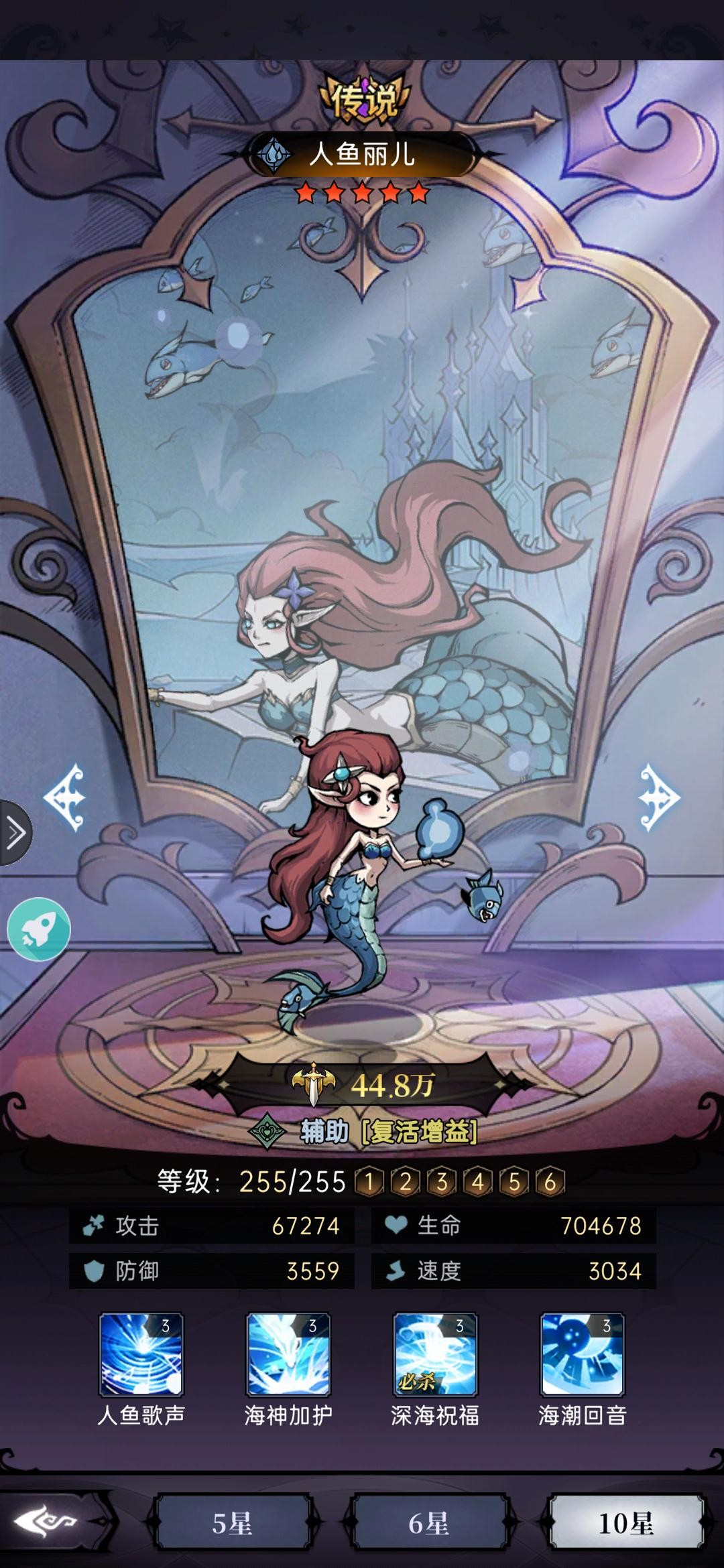 技能简介:人鱼歌声:为我放攻击最高两名单位驱散所有负面效果和控制并加血,增加暴击(主动1技能,冷却4回合)