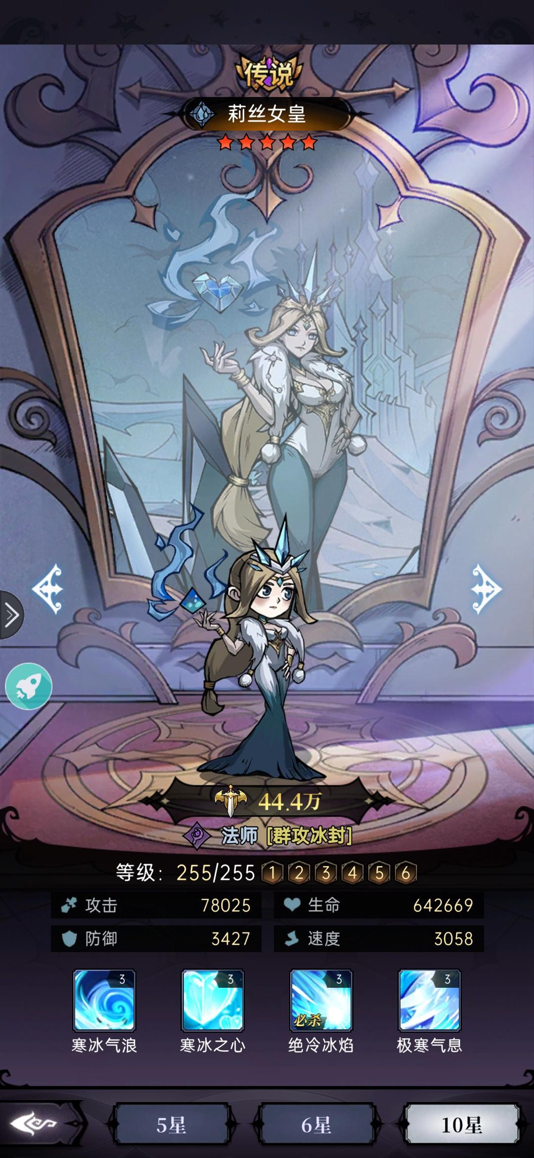 技能简介:魔力怒放:对敌方速度最高单位造成伤害,有80%概率冰封,同时为我方生命最低单位增加一个格挡盾(主动1技能,冷却4回合)
