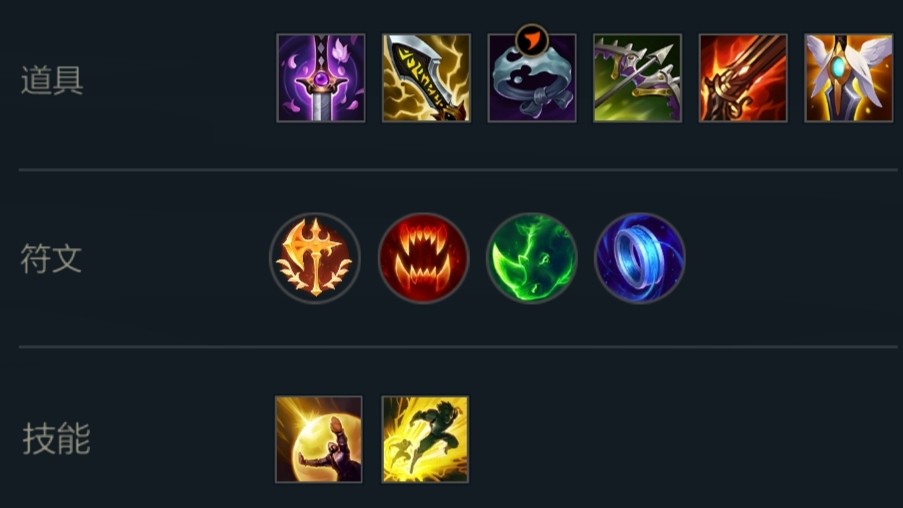好运姐的技能不作过多介绍,游戏内都能看到。Q技能表面没有什么复杂的机制,只说明了可以暴击,可以附加命中效果。Q两段都可以触发被动。Q技能的两段伤害都能触发破败;Q技能的两段伤害都能触发不灭之握;Q技能的两段伤害都能叠加黑切;Q技能的两段都可以吸血;只有Q的第一段能叠加征服者;Q的第一段可以触发幕刃效果;二段Q必定暴击。