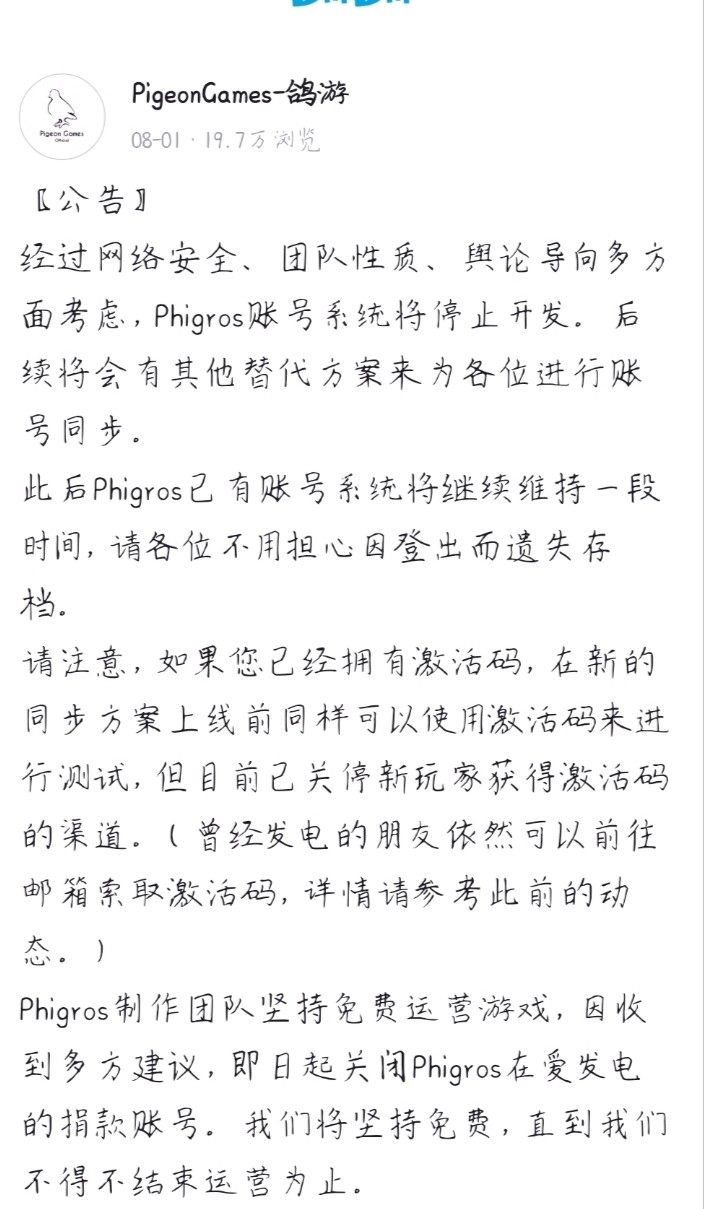 现在也作为phigros比较艰难的时刻,虽然在最初研发账号系统的时候,就已经决定在爱发电通过捐献渠道来获得账号激活码的方式,来获取可以激活的账号。