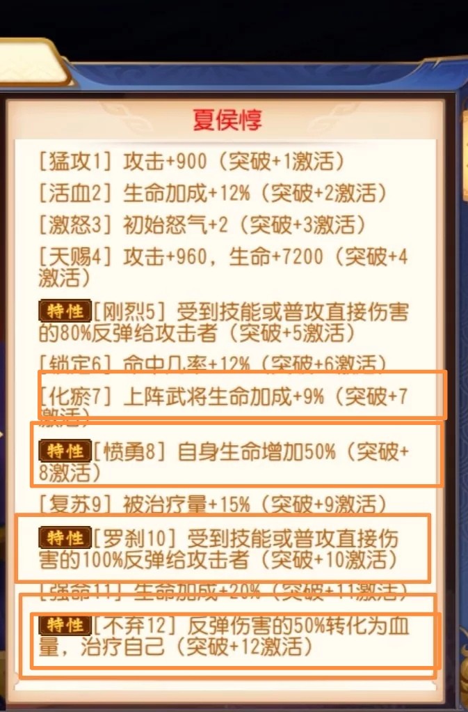 👹特性8和特性11。单纯的增加50+20的血量。可以说是非常重要的技能。不管是卡伤害。分摊伤害。反伤害。肉将夏侯惇都需要大量的生命去支撑。才能发挥作用。特别是夏侯惇反伤机制记得~血量的高低就决定反伤害的强弱。