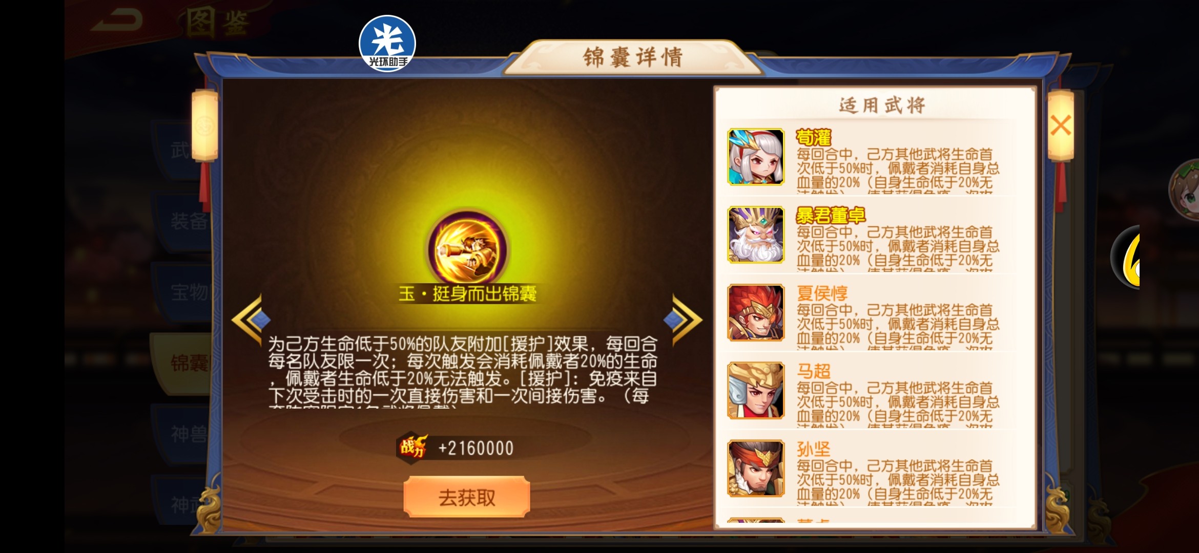 关羽锦囊、孙坚锦囊、庞统锦囊、夏侯惇锦囊、董卓锦囊、曹操锦囊、神·黄月英锦囊、、广厦之荫锦囊、固若金汤锦囊。袁术锦囊(土豪玩家可以选择玉。挺身而出+玉。兰艾同兰)