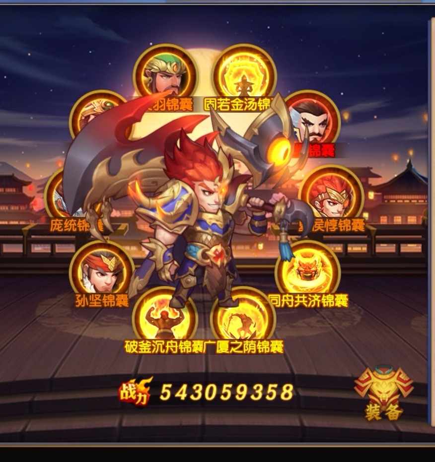 关羽锦囊、孙坚锦囊、庞统锦囊、夏侯惇锦囊、董卓锦囊、曹操锦囊、神·黄月英锦囊、破釜沉舟锦囊、广厦之荫锦囊、固若金汤锦囊。