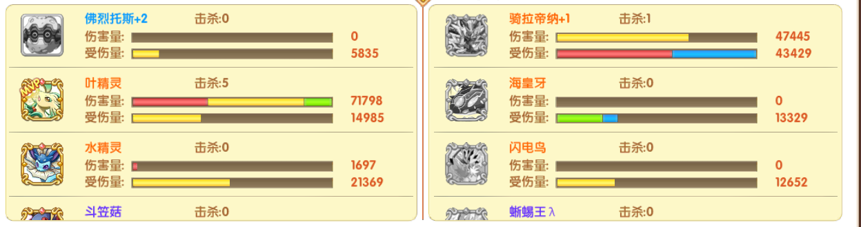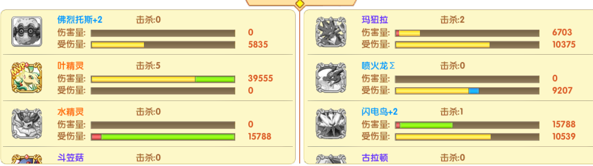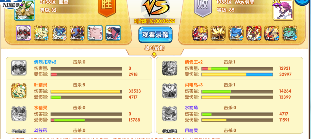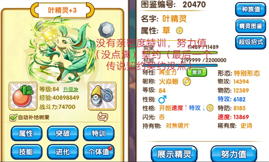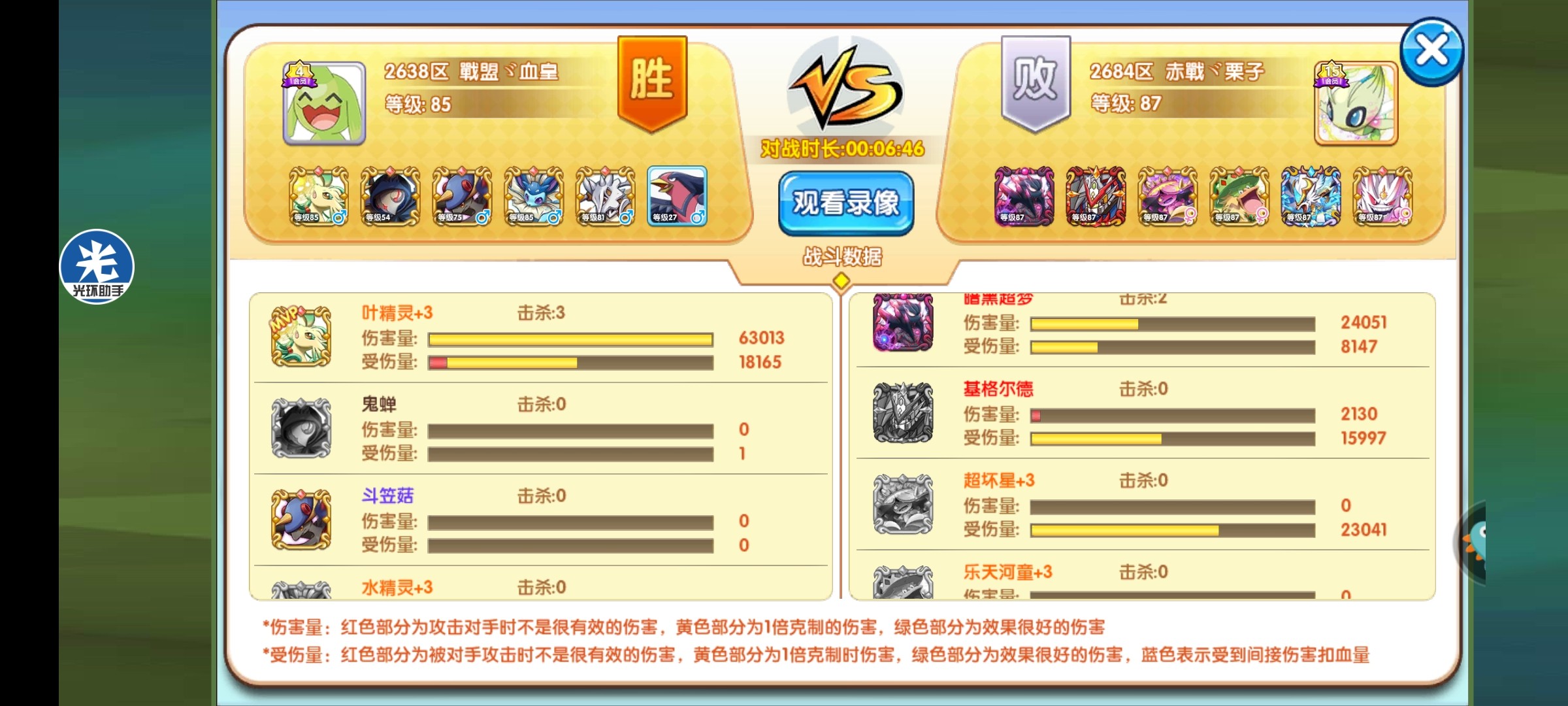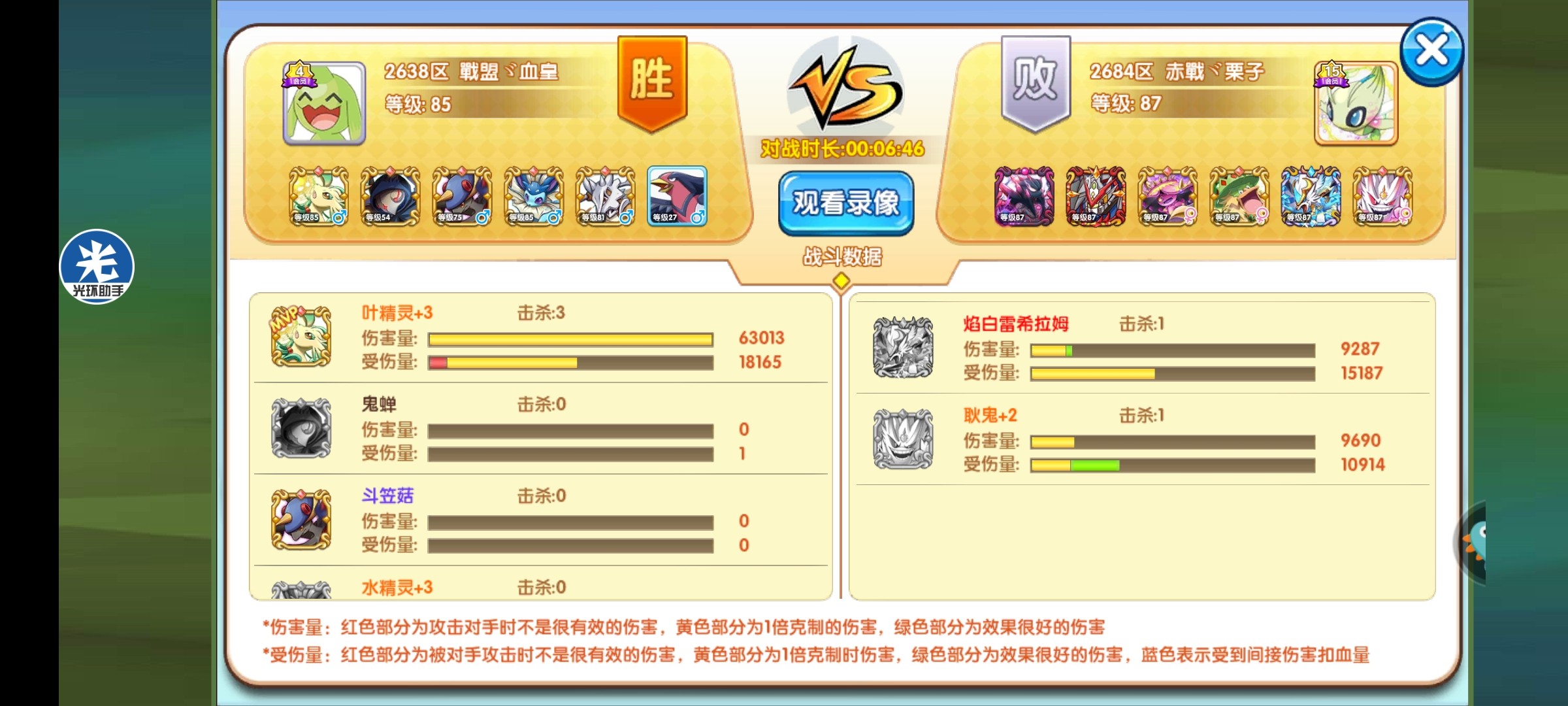 总结:叶精灵是平民玩家一只不错的宠物,可以打绝大多数宠物,和海皇牙绝搭。目前环境也不是太好,如果是真爱的话,选它没错了,不过加上珍藏后打击面除了刚系,其它都能较好的处理,虽然珍藏非本系,但是这也是补充打击面的最优技能了,暴击也是能打出可观的伤害的。再生力特性的灵活多变,也适合打游击,。注意天敌后,也能无脑上场睡眠对方,然后进行强化,推队。推队是有这个能力,你可以参考我上面的数据图,澄三天敌闪电鸟被秒杀。由于是以前的视频过期了不能拍下来给大家看,以后我会补上来。总之,套路就是睡眠,强化,刀叶,珍藏,开大,推队。这只宠也是6.5折,如果比较烦大力鳄,大剑鬼,海皇牙,巨沼怪和其它猥琐宠物的小伙伴也可以配个叶精灵。