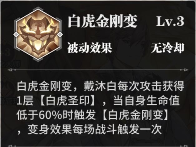 戴沐白的每次攻击都可获得白虎圣印,生命低于60%触发白虎金刚变进入变身形态。