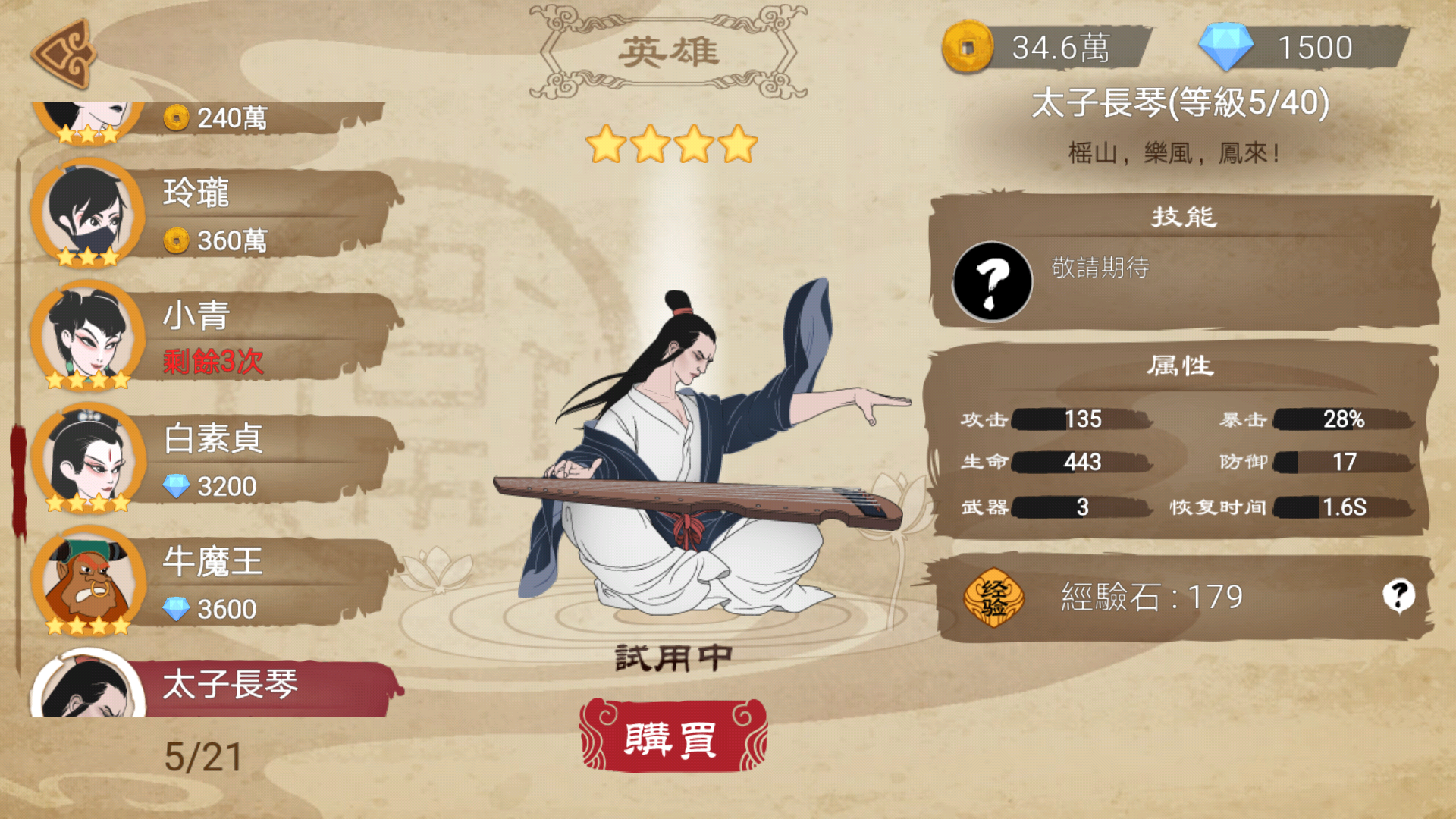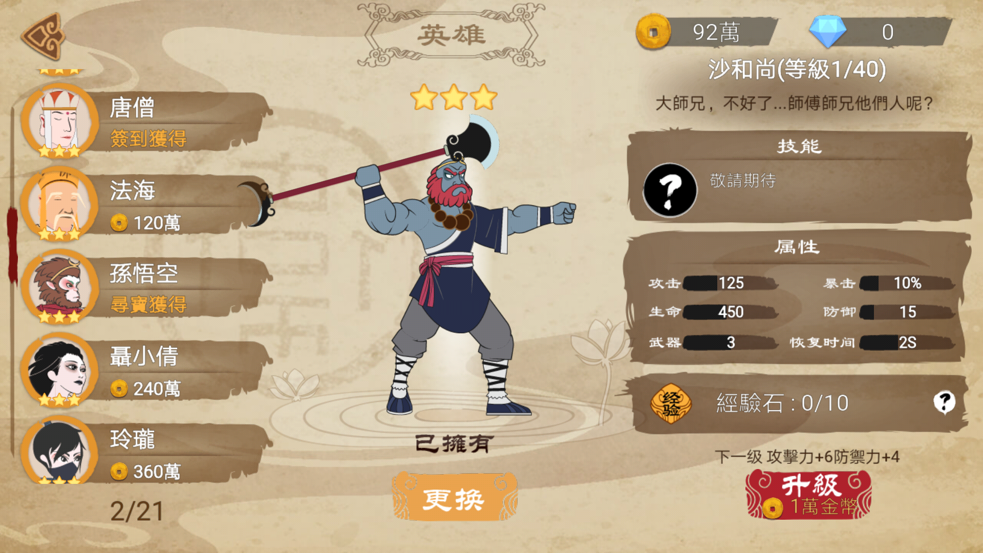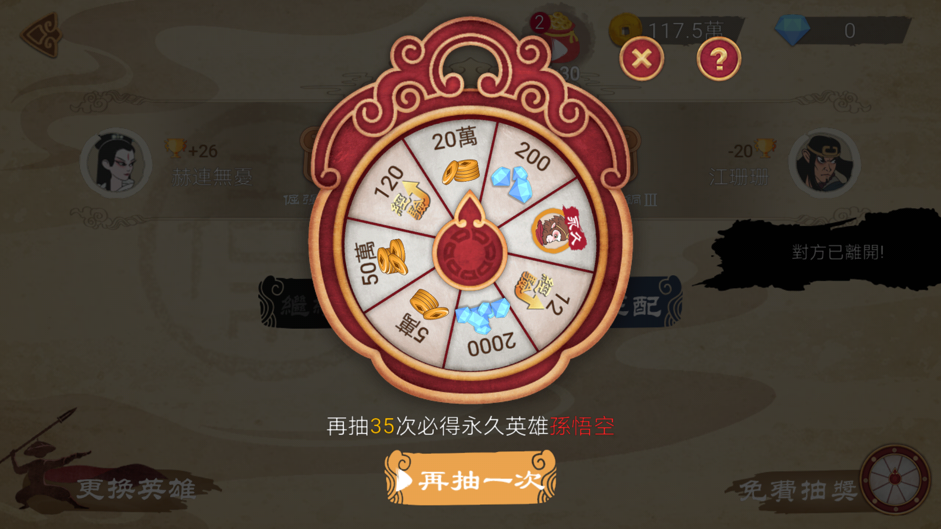 说到角色,我不禁要夸下游戏的开发者的想象力了,把这些西游记、新白娘子传奇、倩女幽魂等这电视剧的主角人物都给凑一起来了。这些角色拥有着不同的血量、武器和技能,获取方式也各有不一。小羊悄悄的告诉大家这游戏大转盘是个好东西,免费转可以获得钱和宝石,40次就能还能获得悟空噢。就是有点耗时间。