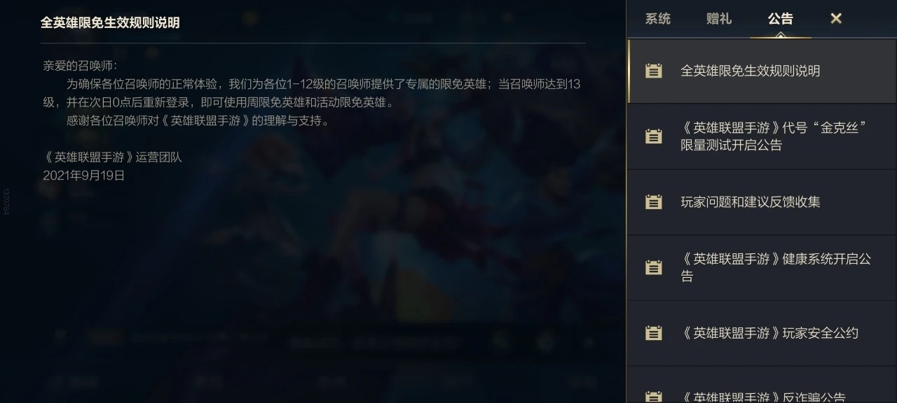英雄联盟手游官方团队,为1-12级的召唤师提供了专属的限免英雄(13级以前没有全英雄);当召唤师达到13级,并在次日0点后重新登录,就可以使用周限免英雄和活动限免英雄。(13级以后应该可以使用活动全英雄)