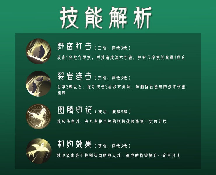 因为精卫常常和大鸟一起拿石头去填海,所以她的技能也和石头有关。1技能【野蛮打击】的效果为攻击一名灵妖,并有几率使其眩晕一回合。2技能【裂岩连击】则是连续召唤3颗巨石对3名敌方灵妖造成伤害,且每颗石头造成的伤害都相同。此外她的被动除了增伤之外,还会进一步减低敌人对控制的抵抗效果。