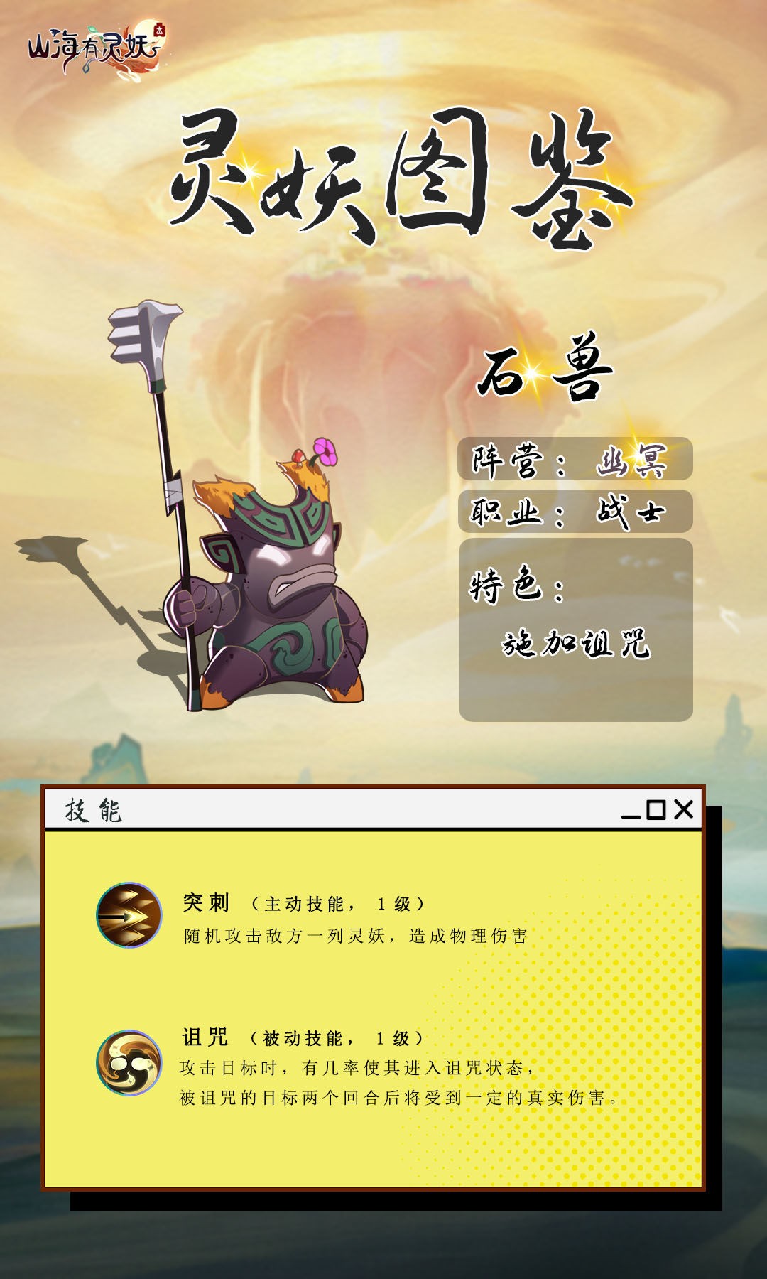 【灵妖图鉴】石兽a.laowang发布于 2021-09-21关注守护轮回大阵第一层的石头守卫。超级爱恶作剧,大脑简单,容易露出坏人得逞般的微笑,实际没什么杀伤力。单纯的坏家伙,并且坏得有点萌,经常还被反欺负的那种。"最喜欢他头上的小fafa!