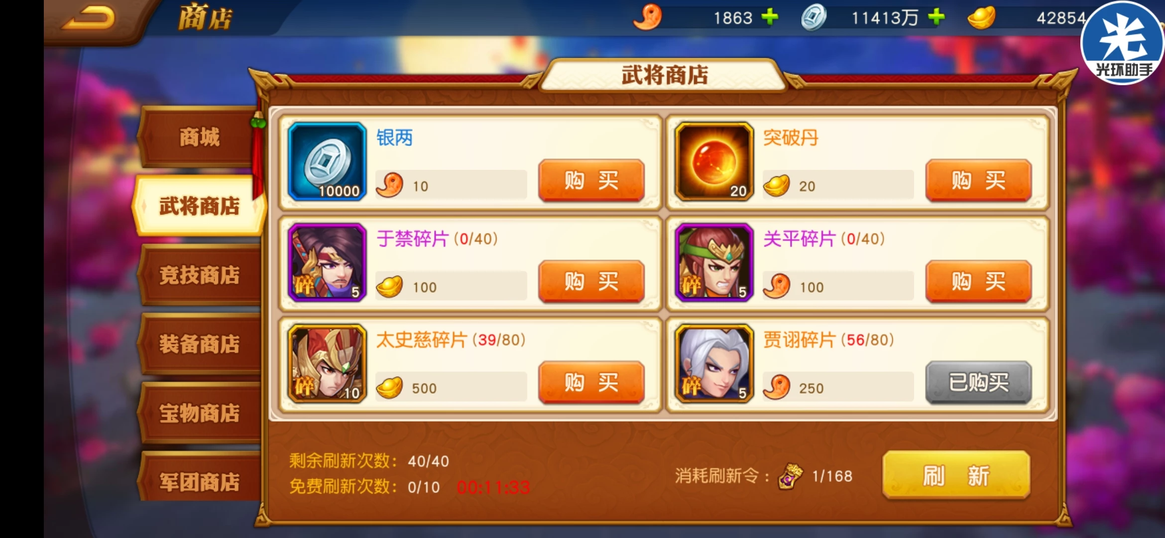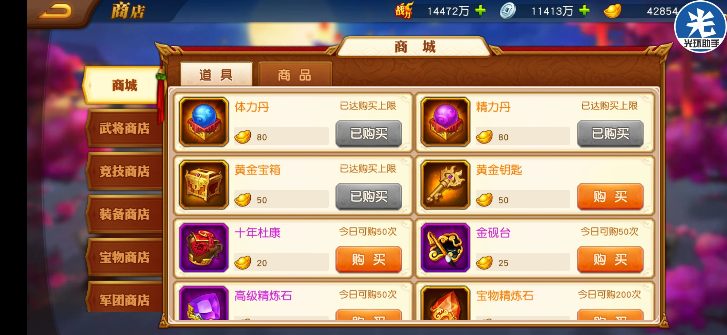 军团商店主要兑换变身卡, 精炼石,突破丹(前期必选),觉醒突破材料,需要的武将碎片。体力丹不多选了武将碎片就少刷武将碎片。神兵突破石需要的时候购买,