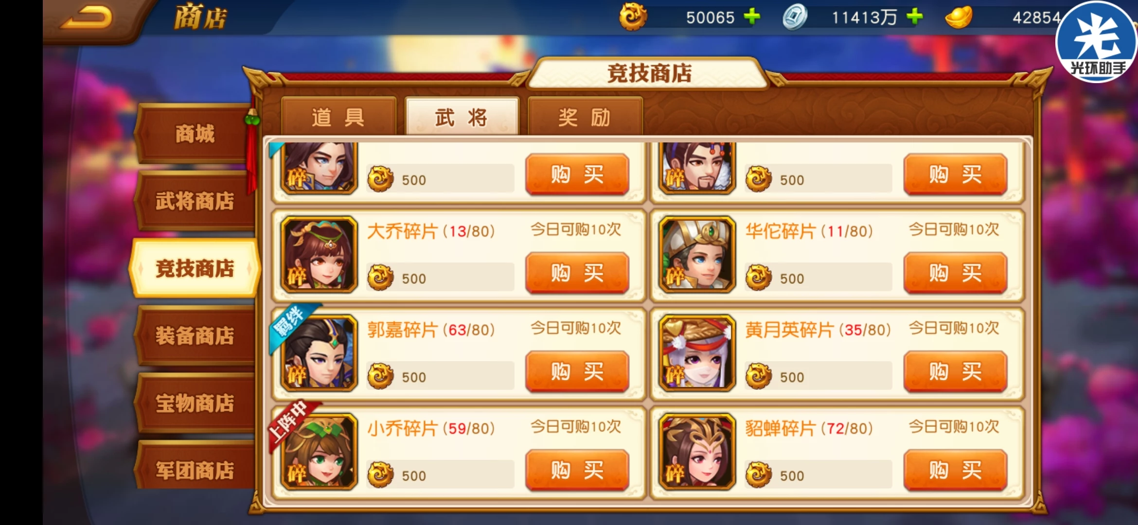 竞技商店前期买需要的武将碎片如小乔还有金币的突破丹,后期买突破丹武将碎片去刷尽量不买。
