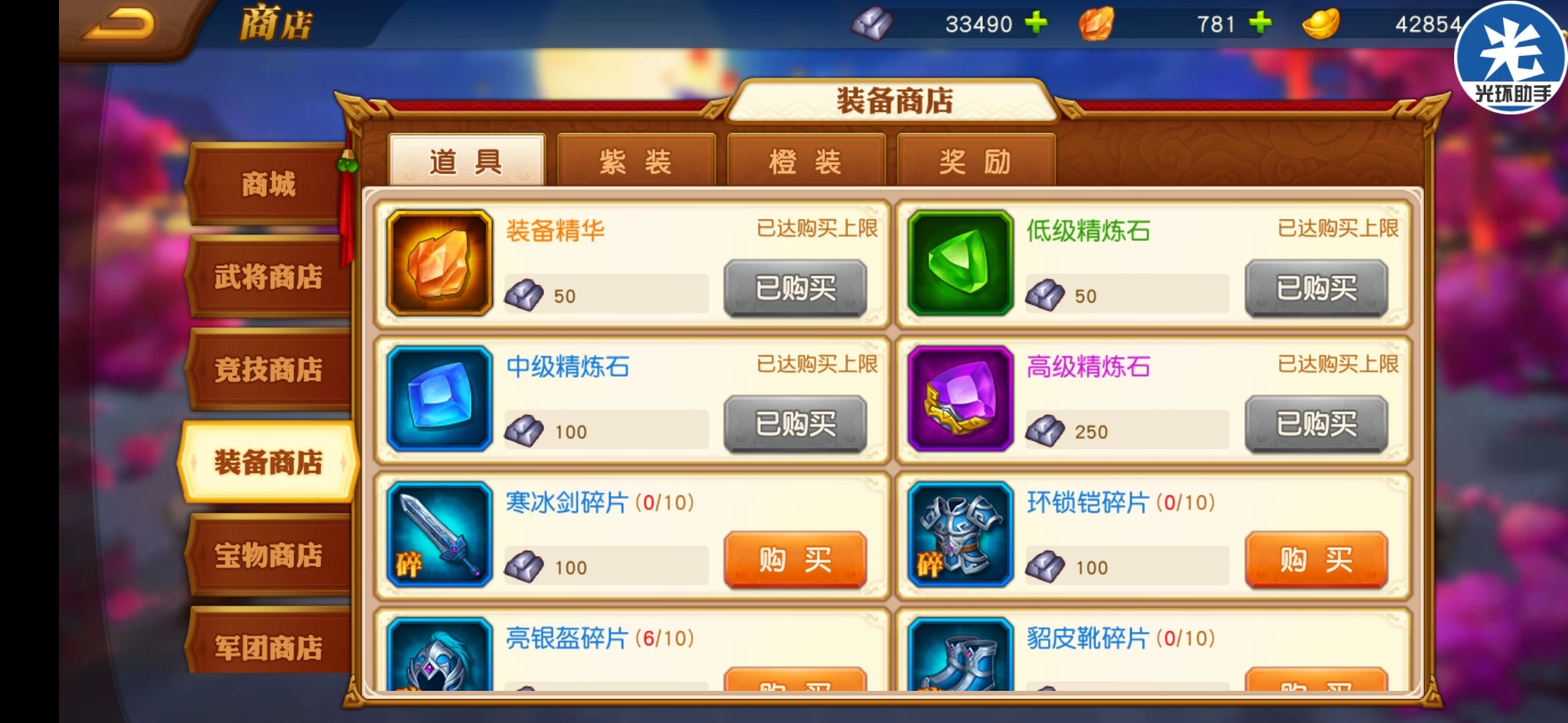 装备商店首选突破丹,前期装备精华的影响还有过关斩将星数未到270星破军装备除了活动没出处。装备先不买多了买一套一般的装备收集主要靠割袍断义活动和阵营站收及王者之战兑换。主买精炼石和精华不是破军少兑换。