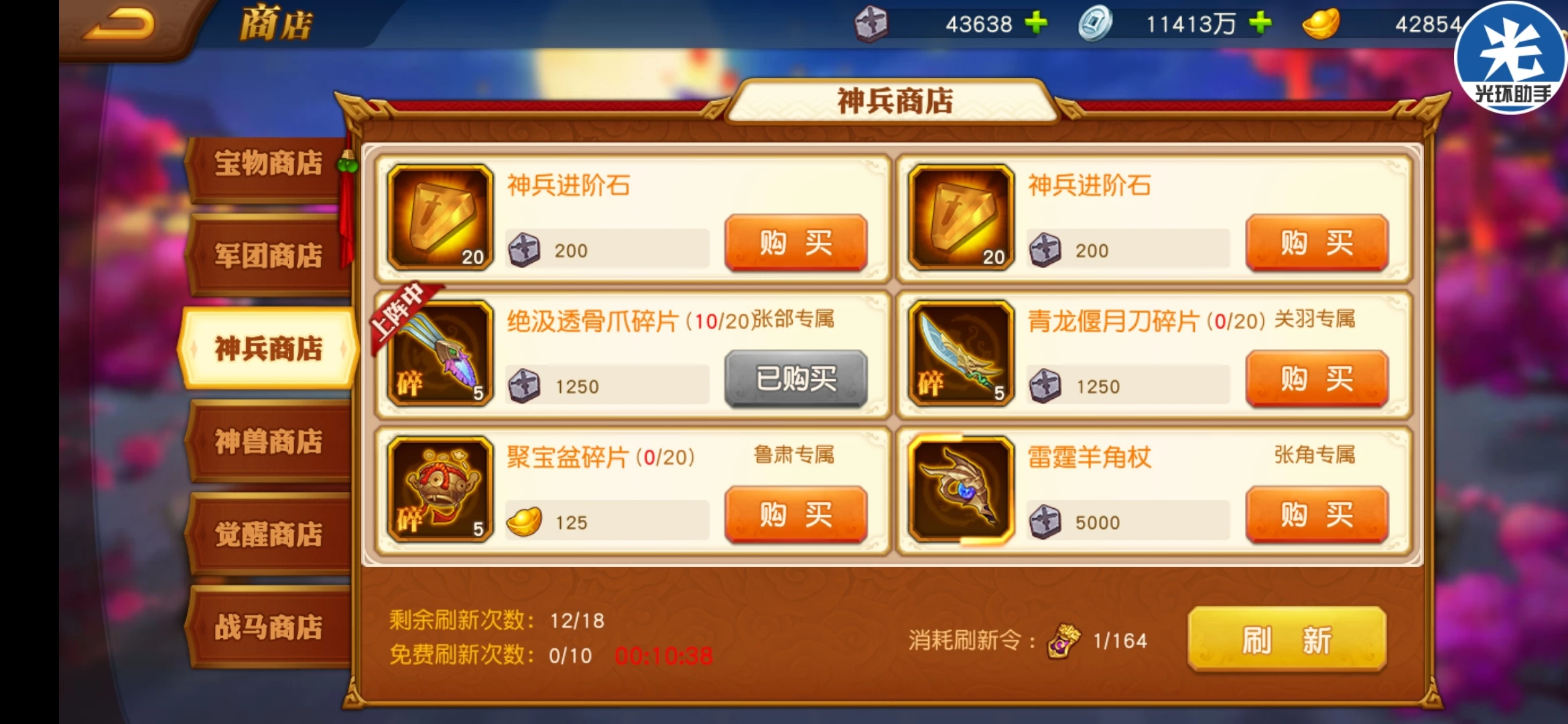 神兵商店前期啥都没有情况下花元宝也要买,同属性武将和万能的神兵看见买特别是前期啥都没有情况下。