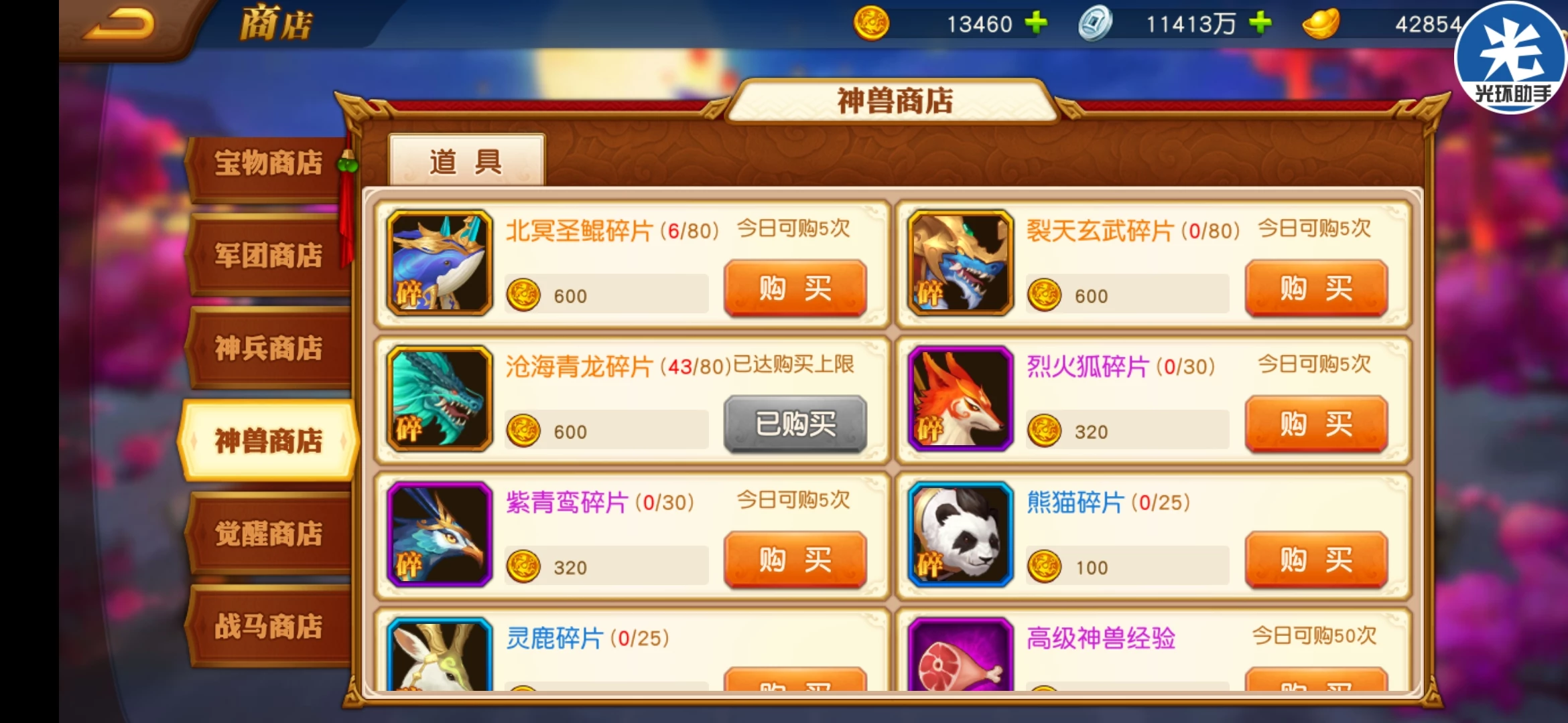 神兽商店前期就弄个鹿,后面主弄青龙最少一星,再弄玄武到五星最后鲲鹏。