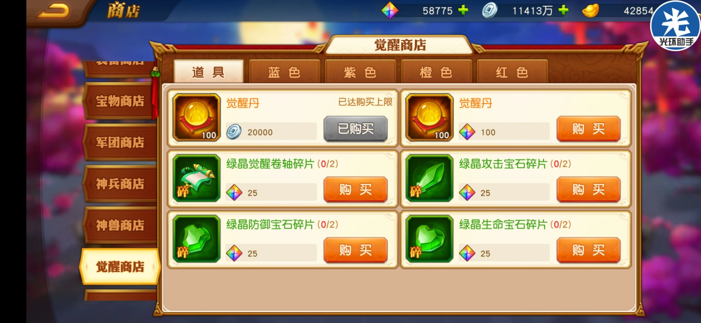 觉醒商店每天金币买觉醒丹。根据觉醒情况买材料。觉醒丹军团商店还可以买。