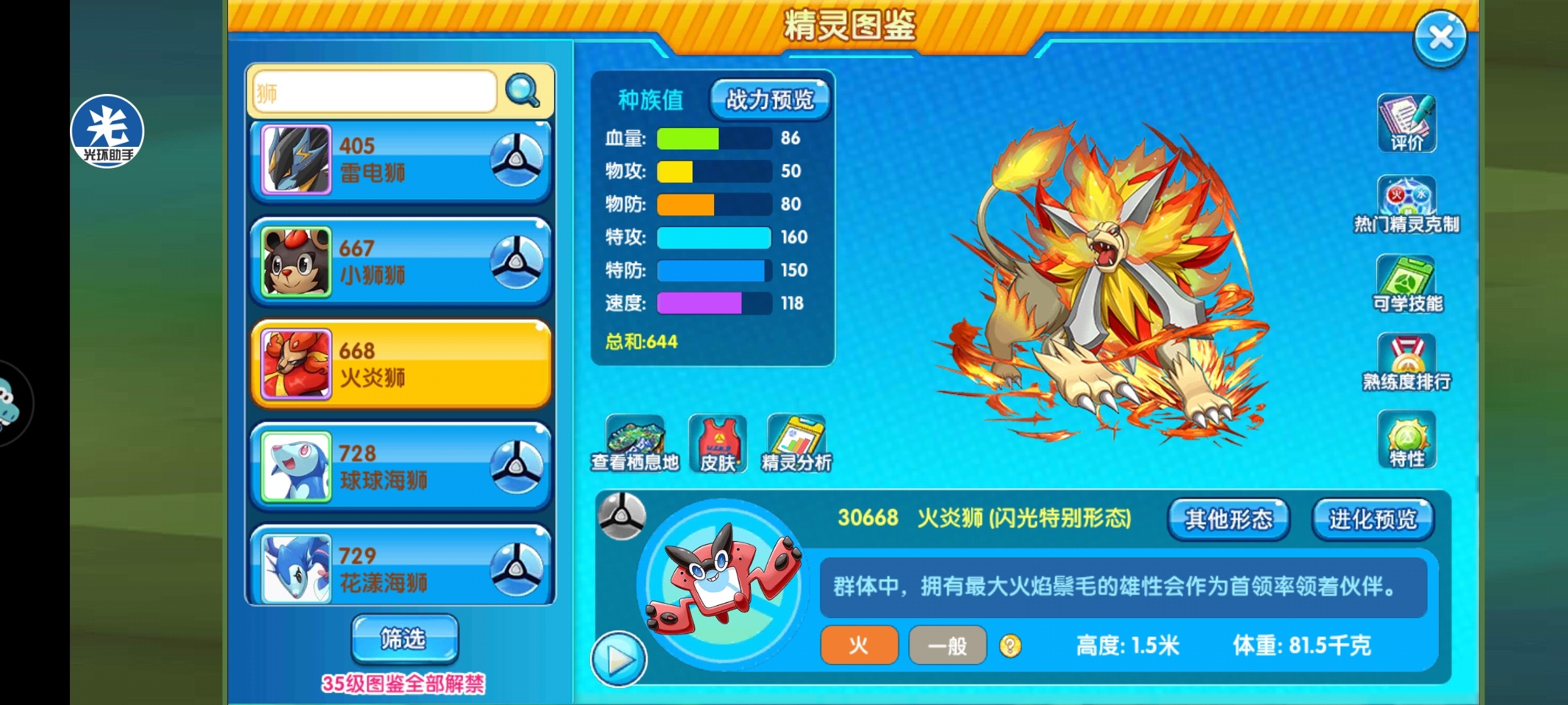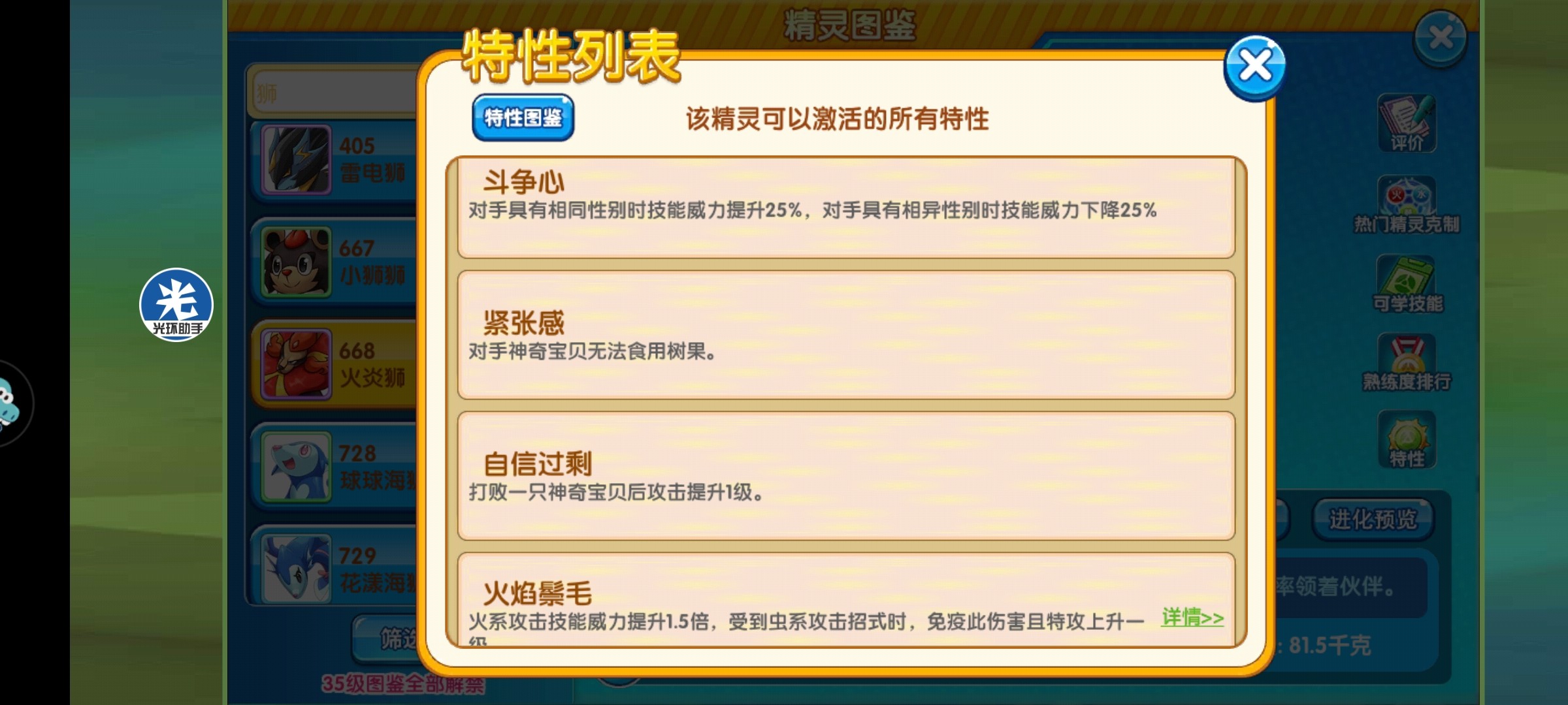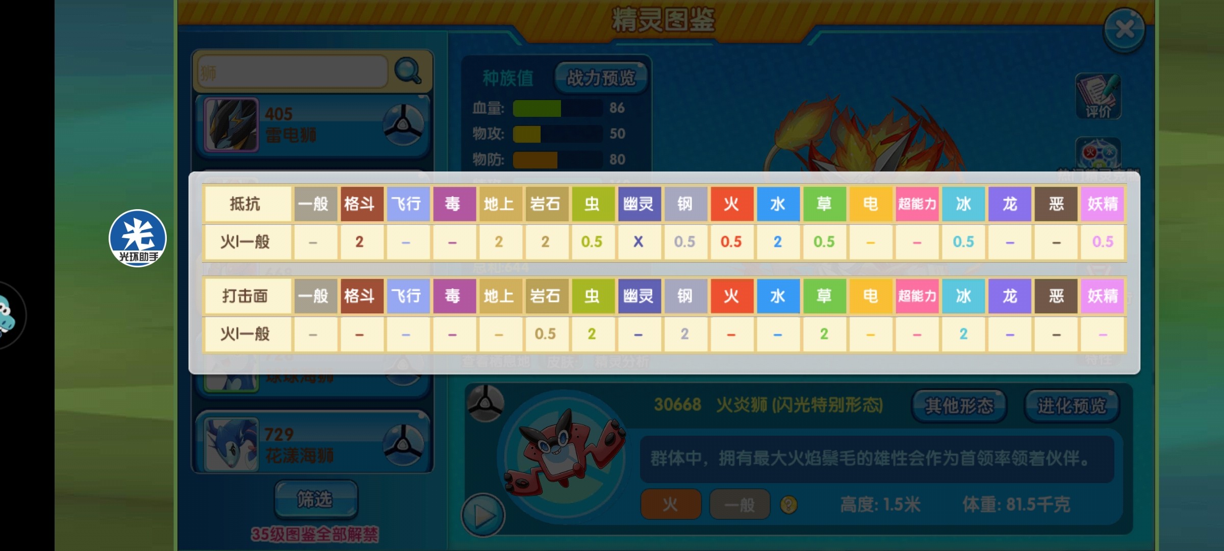 我们可以看到,闪光火炎狮是火+一般双属性精灵,它免疫幽灵属性,抵抗妖精、火、草、虫、冰属性。如果要玩输出火炎狮就必须格外注意克制关系,如果是打游击,被克制的可以忽略不计。