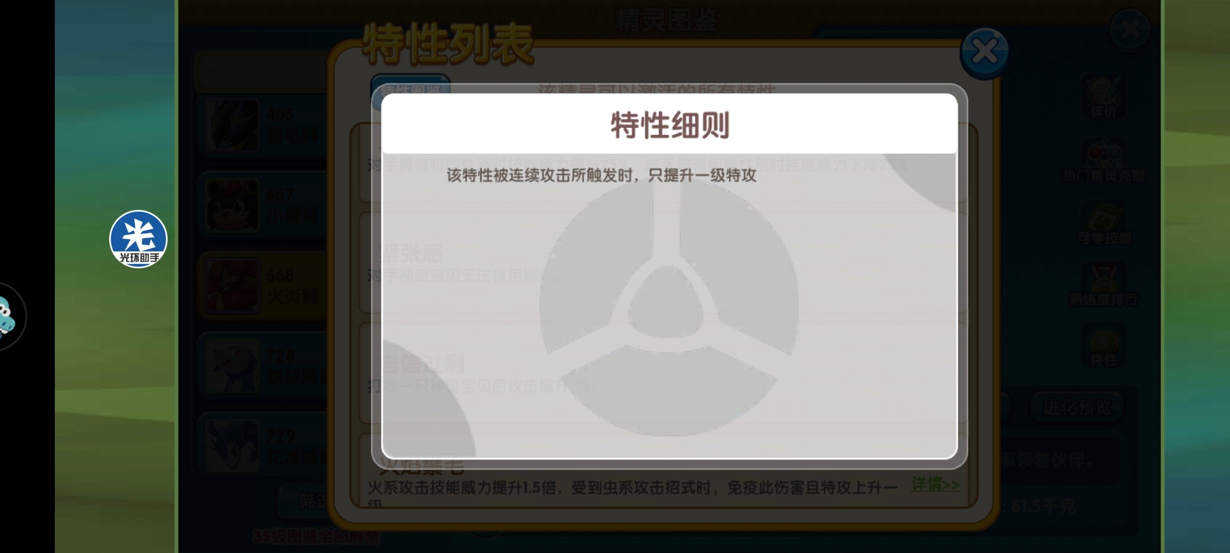 (2)火焰鬃毛:火系攻击技能威力提升1.5倍,加上火炎狮可以学习过热这个高威力火系技能,伤害岂不爆炸?而且受到虫系攻击会免疫此攻击且特攻提升一级,这就非常吃预判了,预判对手的急速转变上场,直接特攻+1,岂不妙哉?因此,想玩输出火炎狮的可以考虑考虑这个特性。