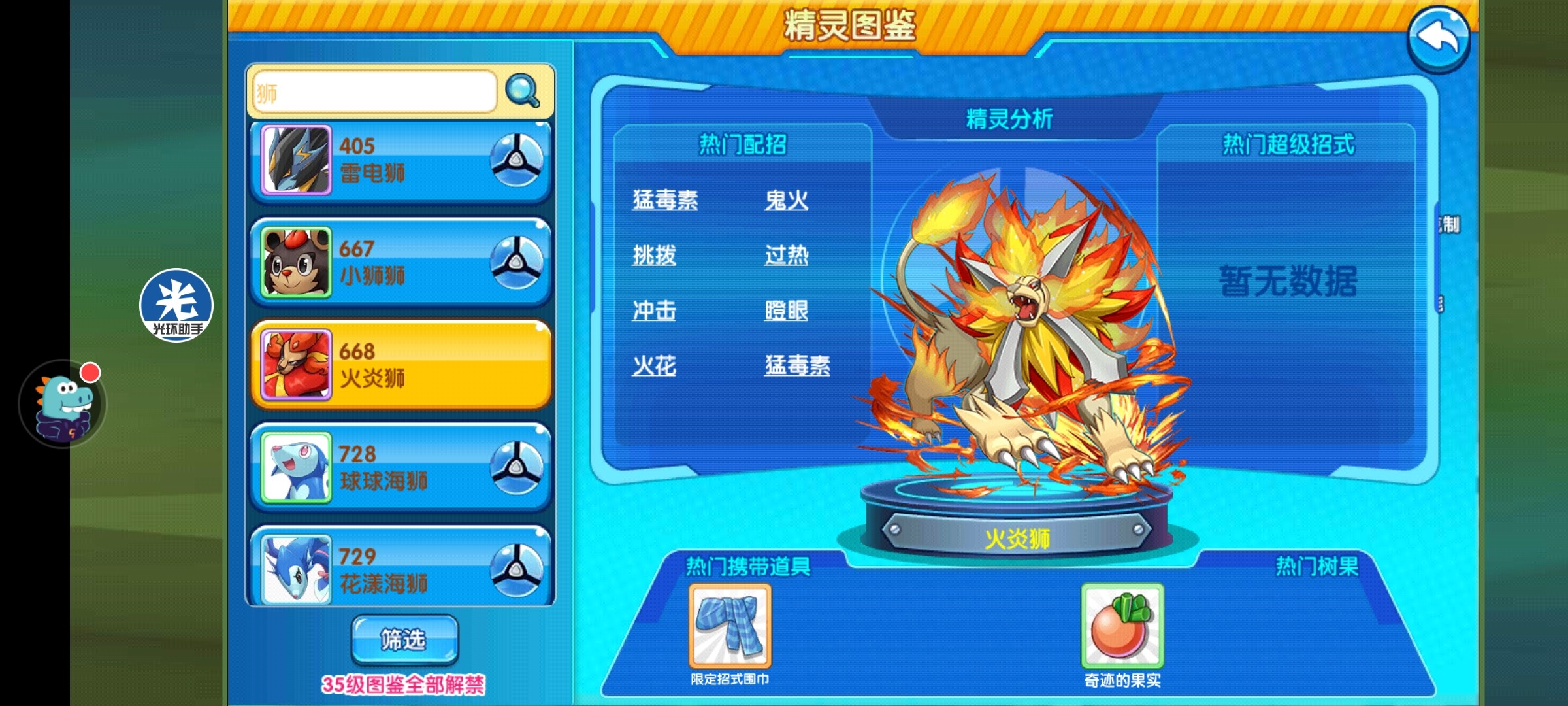 总结: 火炎狮是一个冷门的骚扰手和收割者。有时候成也狮子,败也狮子,因为鬼火miss,过热miss,猛毒miss,而导致被对面翻盘的局,但总体来说,围巾狮子的好处完全可以掩盖它的劣势,如果哪位训练师对火炎狮有兴趣的话,可以试试。