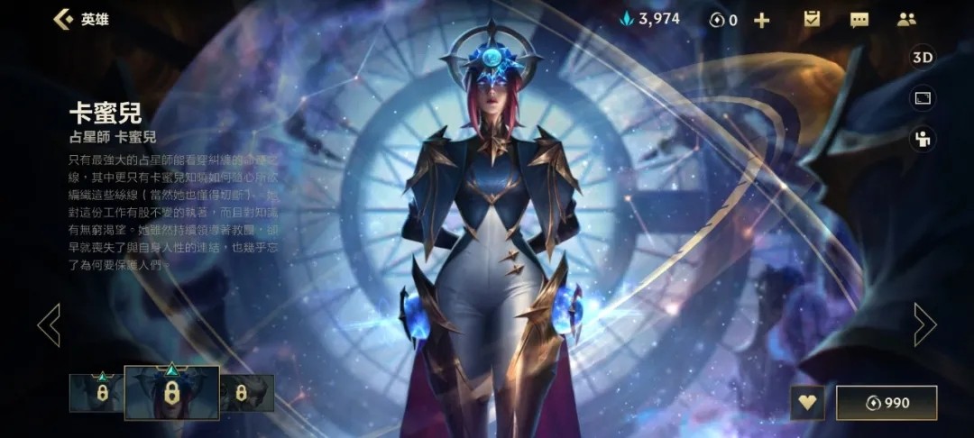 手游君点评:崔斯特的此款皮肤是「星域系列」里最炫酷的一款,亦是最贵的一款,与死兆星烬、神王系列、源计划艾希、欧米伽提莫等皮肤一样,售价均为990点券,还是对得起这个价格。