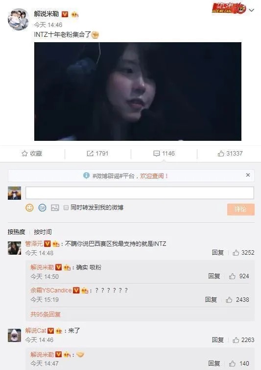 虽遗憾输掉了比赛,但结束后Mayumi开始在国内外各大社交平台刷屏,又迅速在LPL走红,之后更是上了微博的热搜。一下涌现出了大堆号称“Mayumi十年老粉”、“INTZ十年铁粉”的好兄弟。