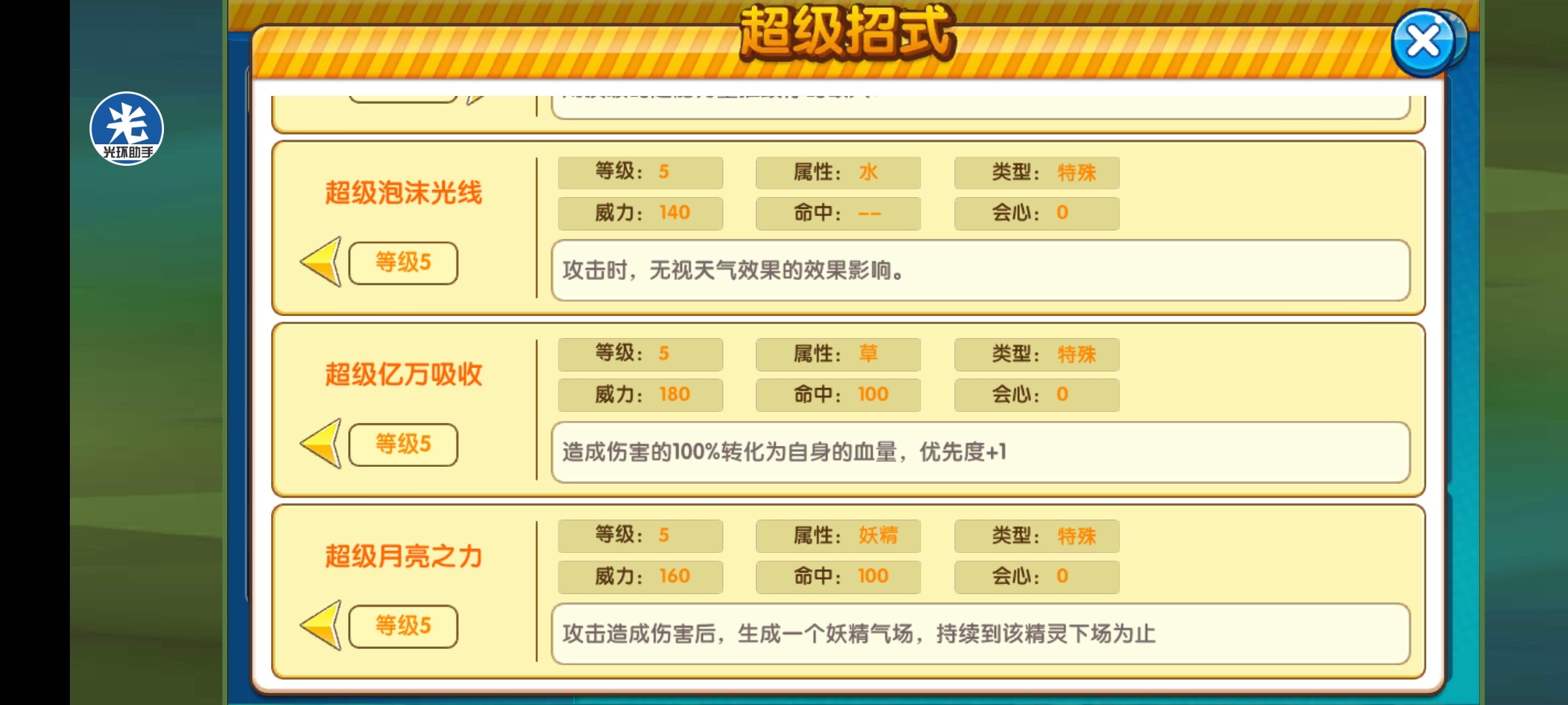 输出类配招:诡计+自我/催眠术/治愈铃铛/超兆亿吸收/喷射火焰/钢魂战爆/灾厄脉冲/基因洞察炮/烈焰红唇/万速/泥石/双端电击/火花/石破天惊弹+广域战力/超能力量/浮游炮+月爆/魔法转换