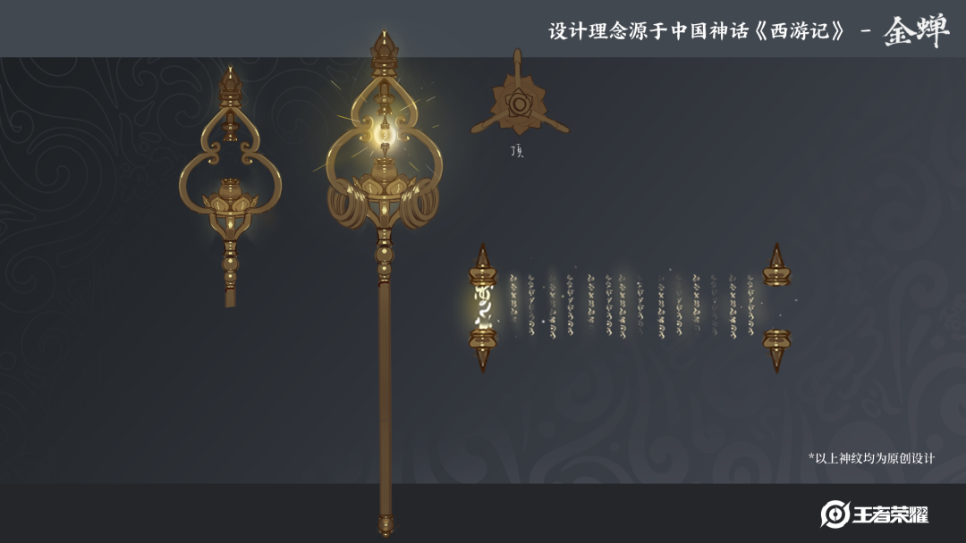 法杖的设计参考来自法门寺地宫的银花双轮十二环锡杖,我们依照西游原著将其改为九环,整体由杖身、杖首、杖顶三部分组成,杖首中间有一卷富有神力的上古之纹。