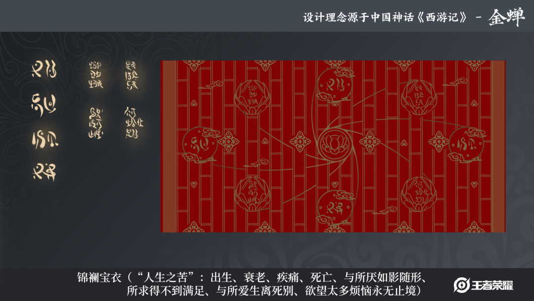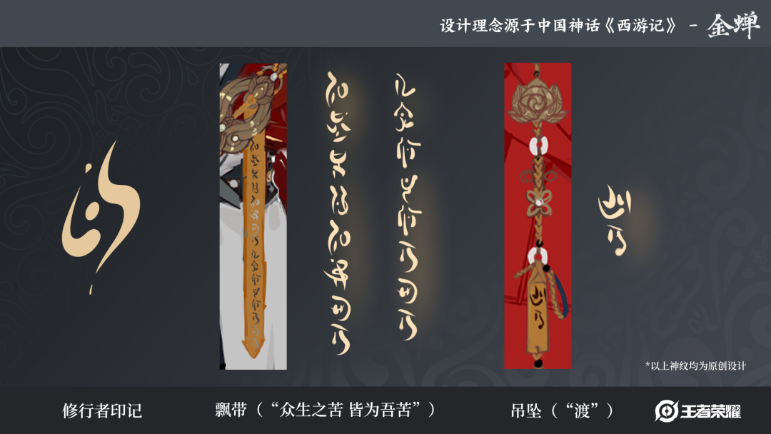 为了契合英雄人设理念、呈现“修行者”能力,我们还独创了一套王者“上古”符号。这套符号镌刻在飘带、吊坠、宝衣的文字设计中,刻画出金蝉所求——“众生之苦皆为吾苦”,时时铭记使命,以“渡”世人苦厄。