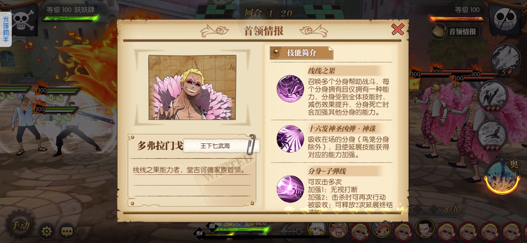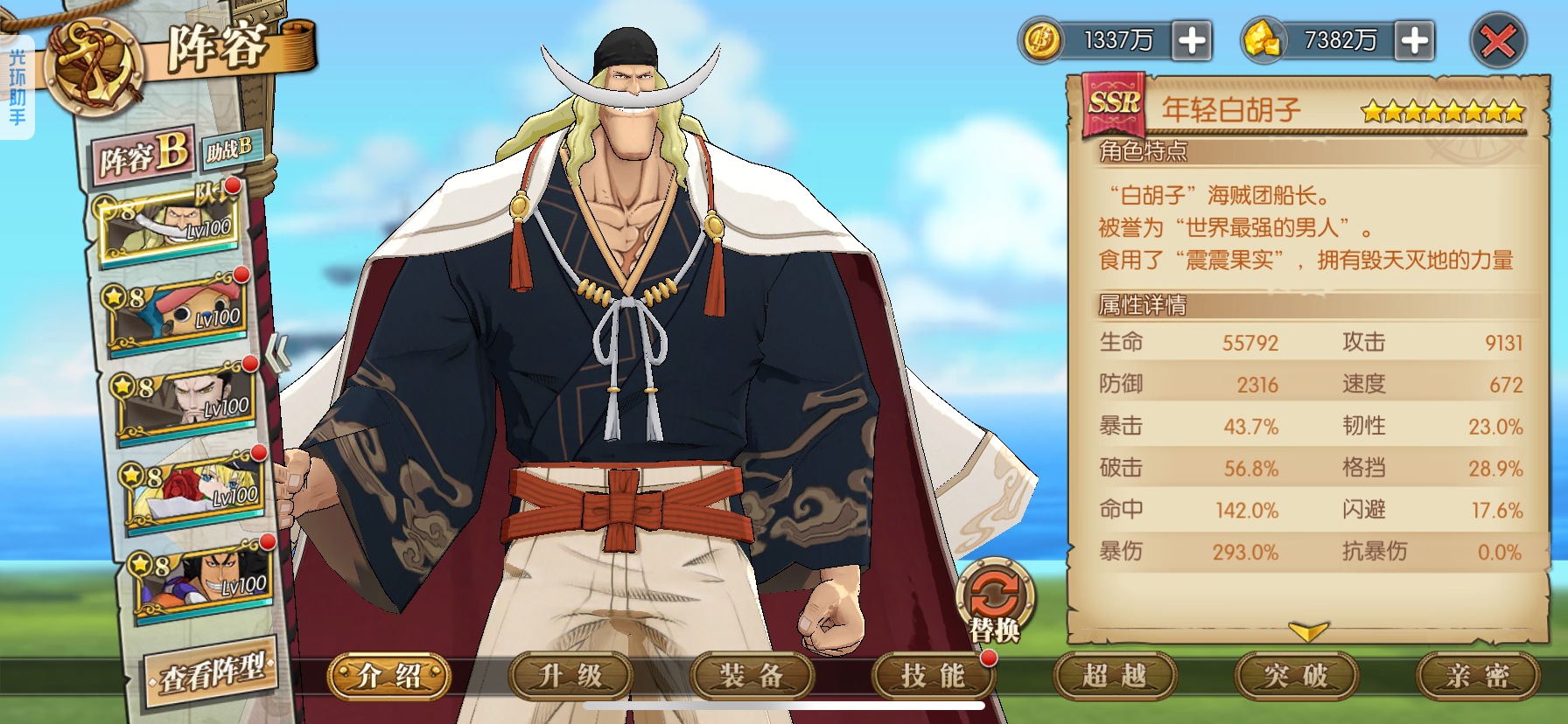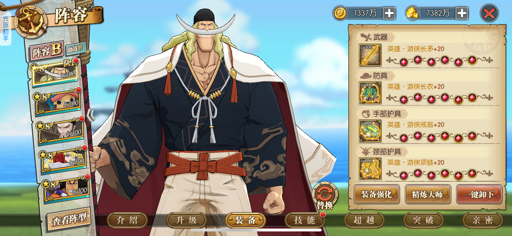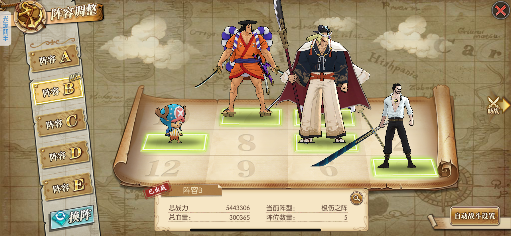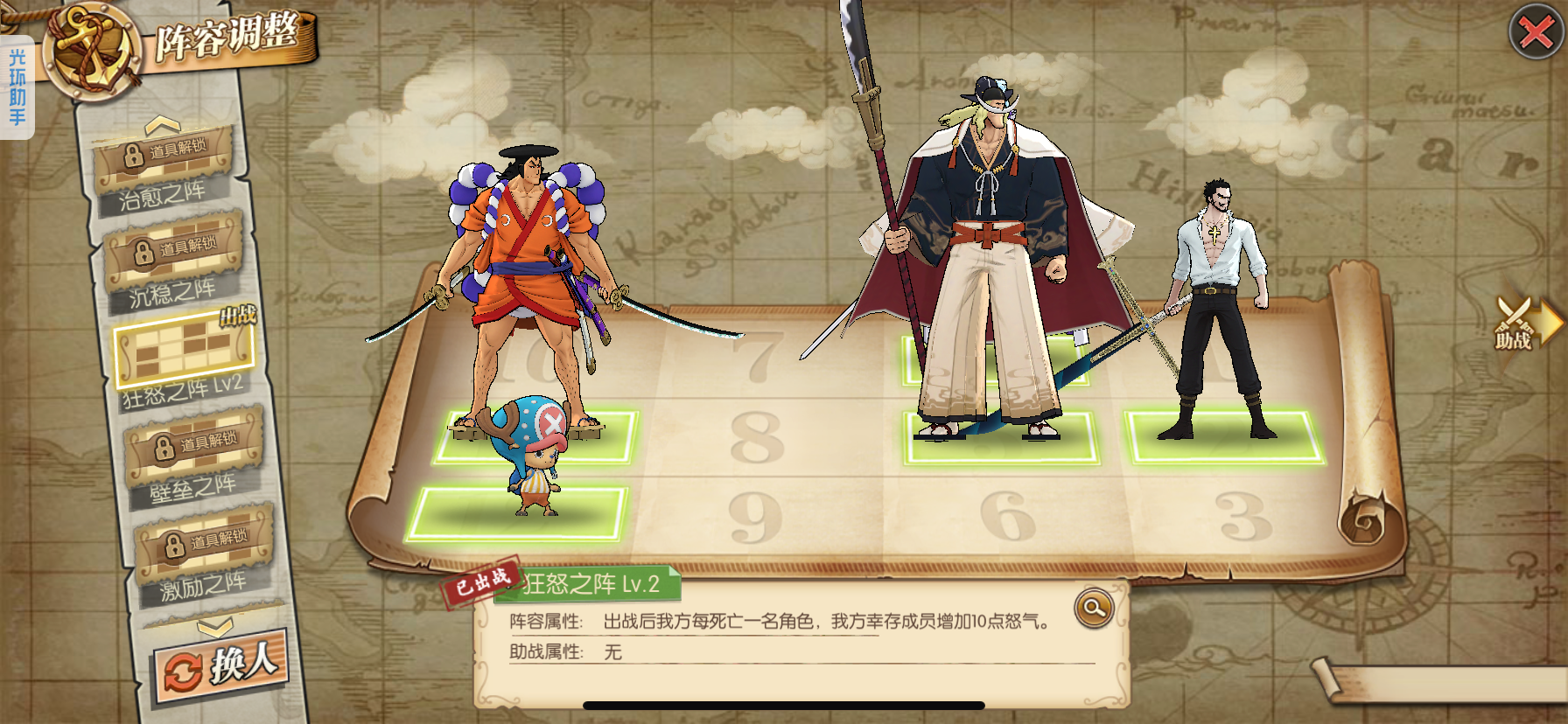 打法:让助阵人物角色都是加攻击,暴伤的buff,上乔巴或小白马为buff提高团队输出,上阵的人物角色都推荐以游侠套装为主,白胡子为主力输出!