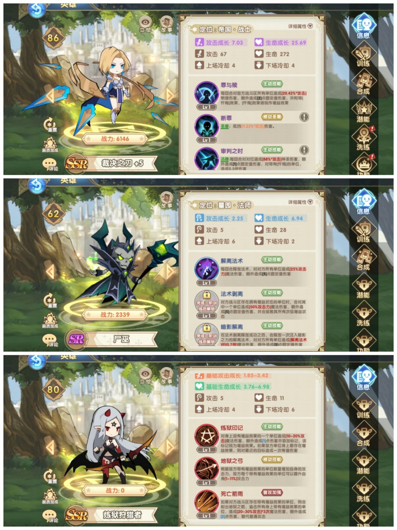 说明:裁决能打能抗,禁卫被击回血,天使回血和输出。帝国三战功勋,符文互相加成。灼魂攻击力加成回血,配合裁决肉的一批。用花仙子也行,天使有回血功能