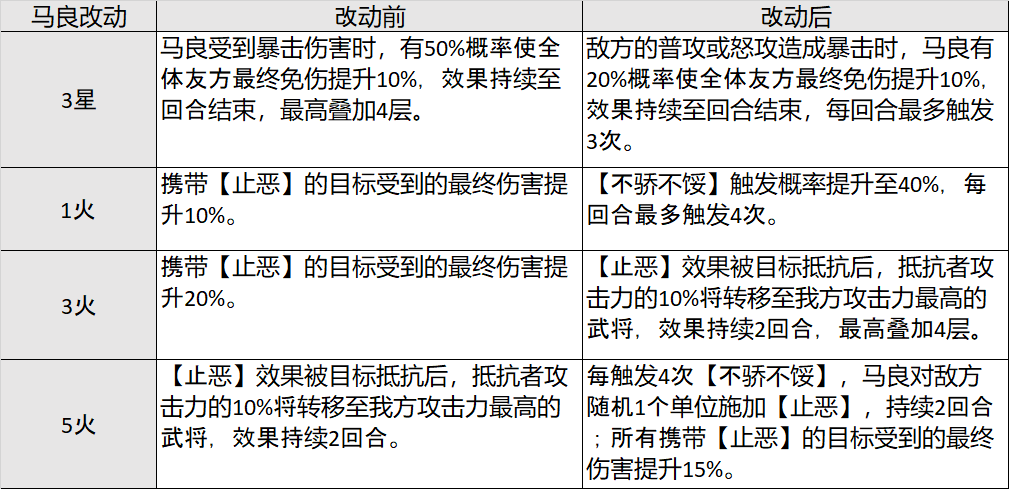 “【马良】可为队伍拥有较为完善的控制、免伤能力;本次调整将降低【马良】前期为队伍提供的免伤能力;提升无双之力阶段时,为队伍提供的免伤能力以及【止恶】效果的触发频次,使其“控制、免伤能力”得到一定的提升,不同阶段时其特性更加明显。”