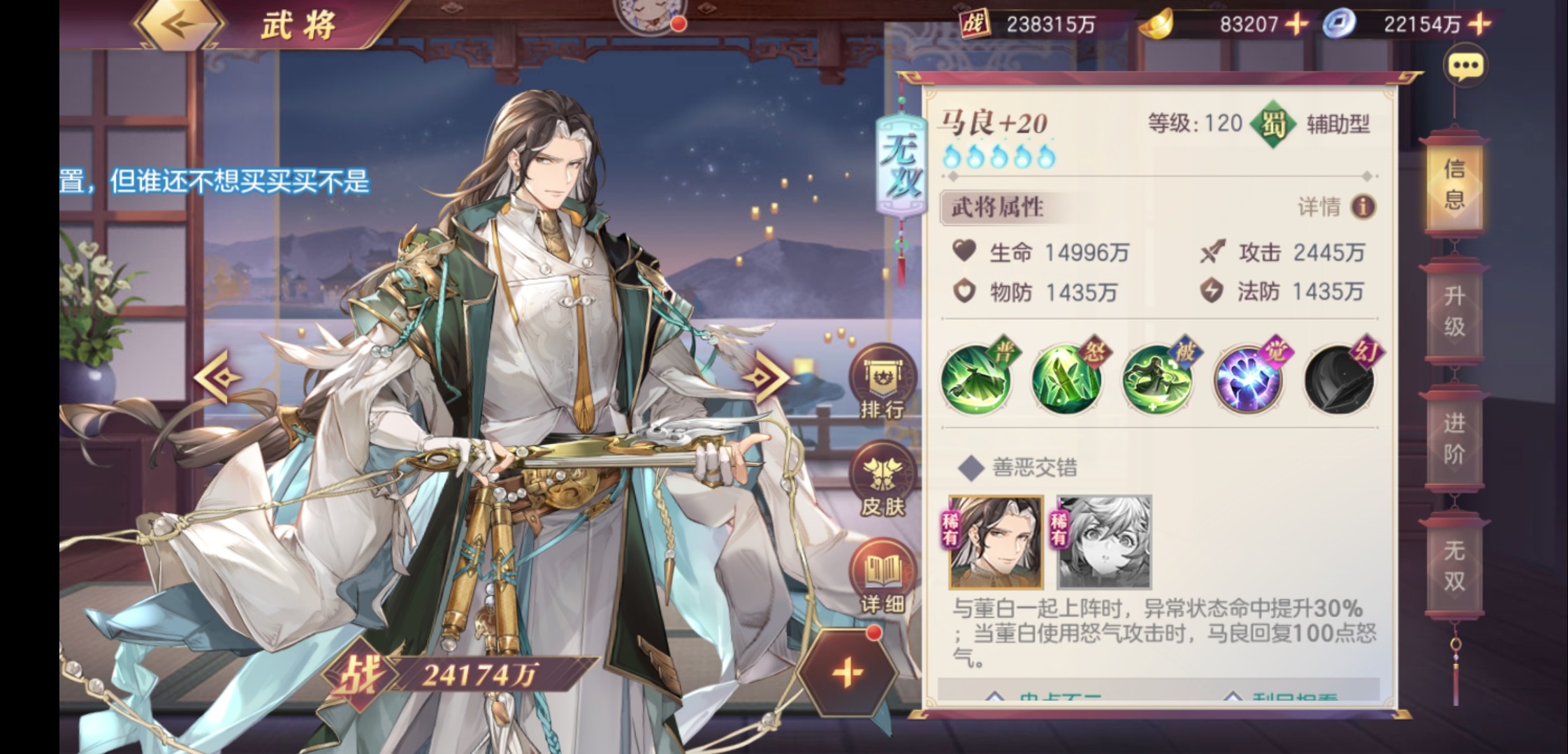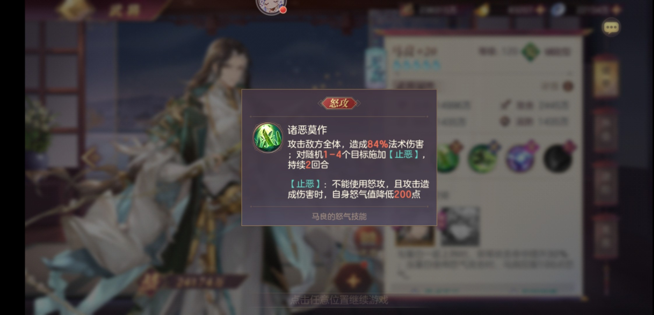 羁绊词条:与董白一起上阵获得异常命中 且董白每次释放怒攻后马良回复100点怒气(积少成多)“异常命中”覆盖面只有马良 设计初衷就是为了提供怒攻的“止恶”施加概率 这是马良控场的主要手段 至于怒气回复也是同理 最大程度保证马良有更高频率的怒攻