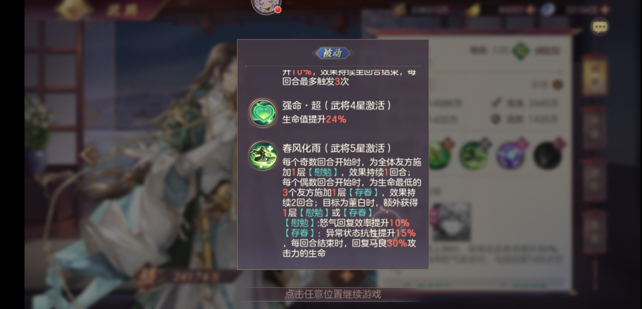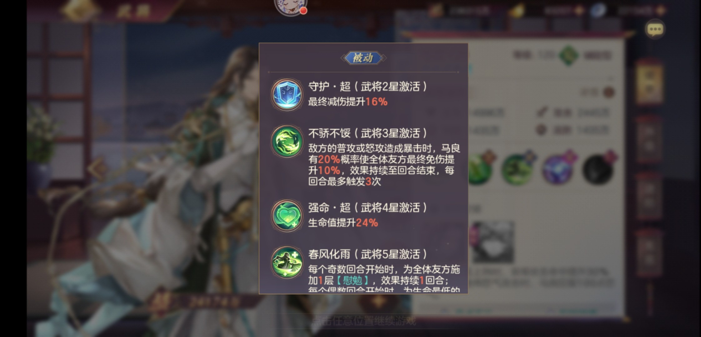 这个被动主要是扶持队友的怒气 异抗和血量续航 没啥优点 数值偏低 中规中矩的技能吧 除了异抗以外另外两条增益可有可无 5星被动跟马良的主要强度无关紧要 算是锦上添花的存在
