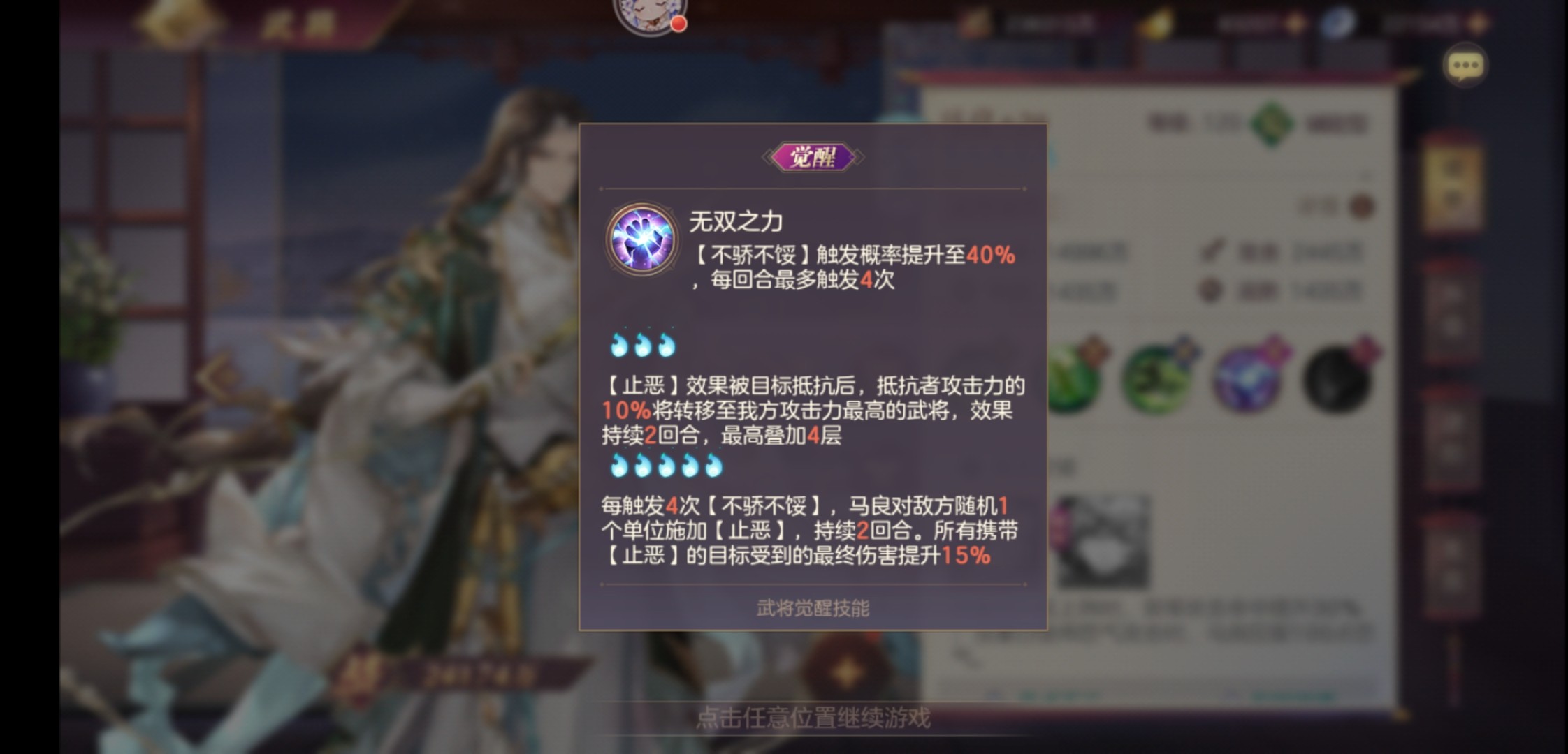 3星被动 马良每次受到来源是怒攻/普攻的暴击有小概率提升全体最终免伤 可叠加 虽然概率数值偏低 在对战吕布 雷霆赵云体系收益较高 如果是单看这个词条确实没啥强度 得搭配觉醒词条一起看