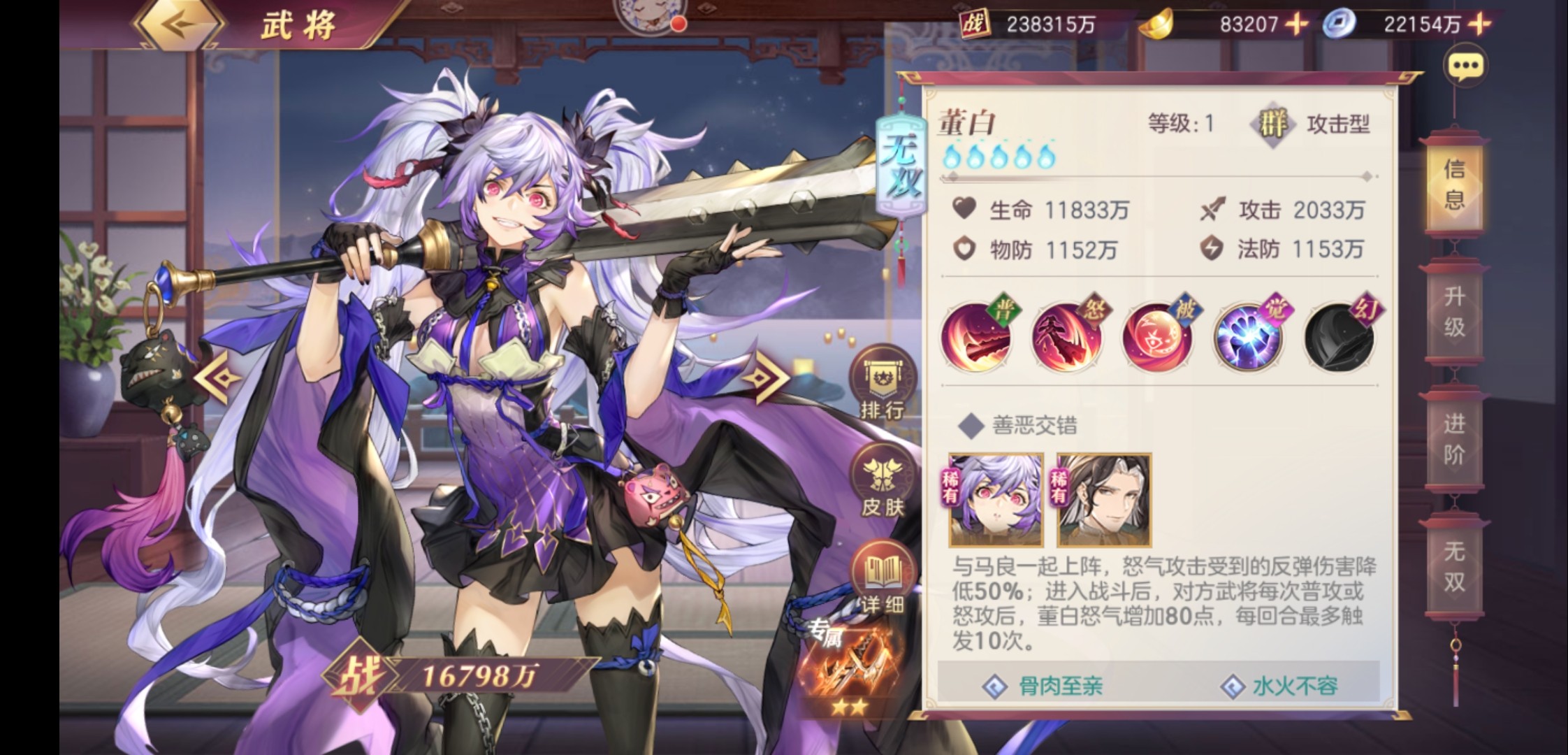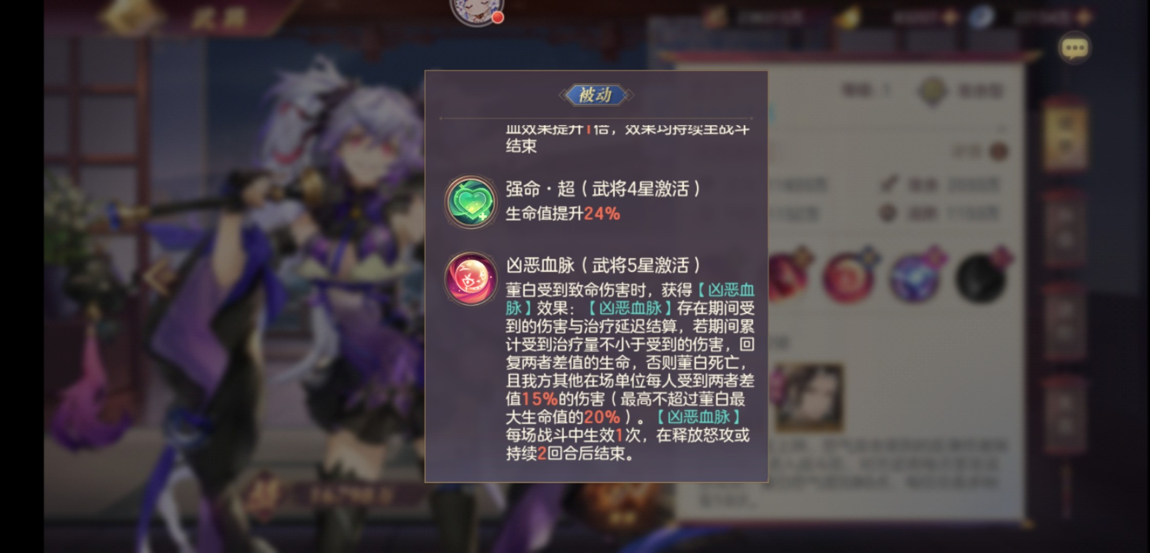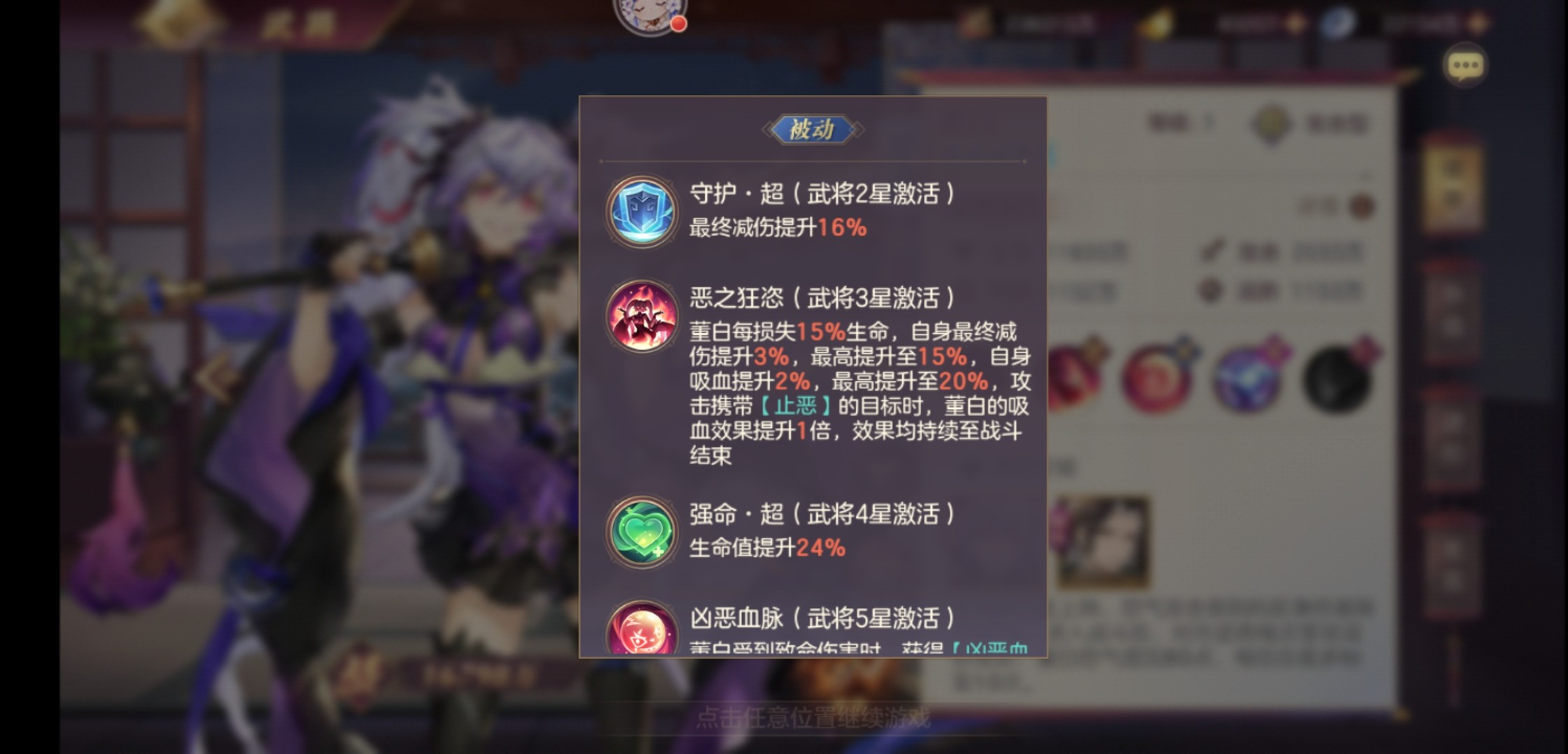3星赋予董白在低血线的情况下 有高额最终免伤以及吸血加持 且对“止恶”目标有额外的吸血效果(说白了马良董白捆绑力度加大了)3星技能足以说明董白的作战方式就是 以血换血 以命搏命