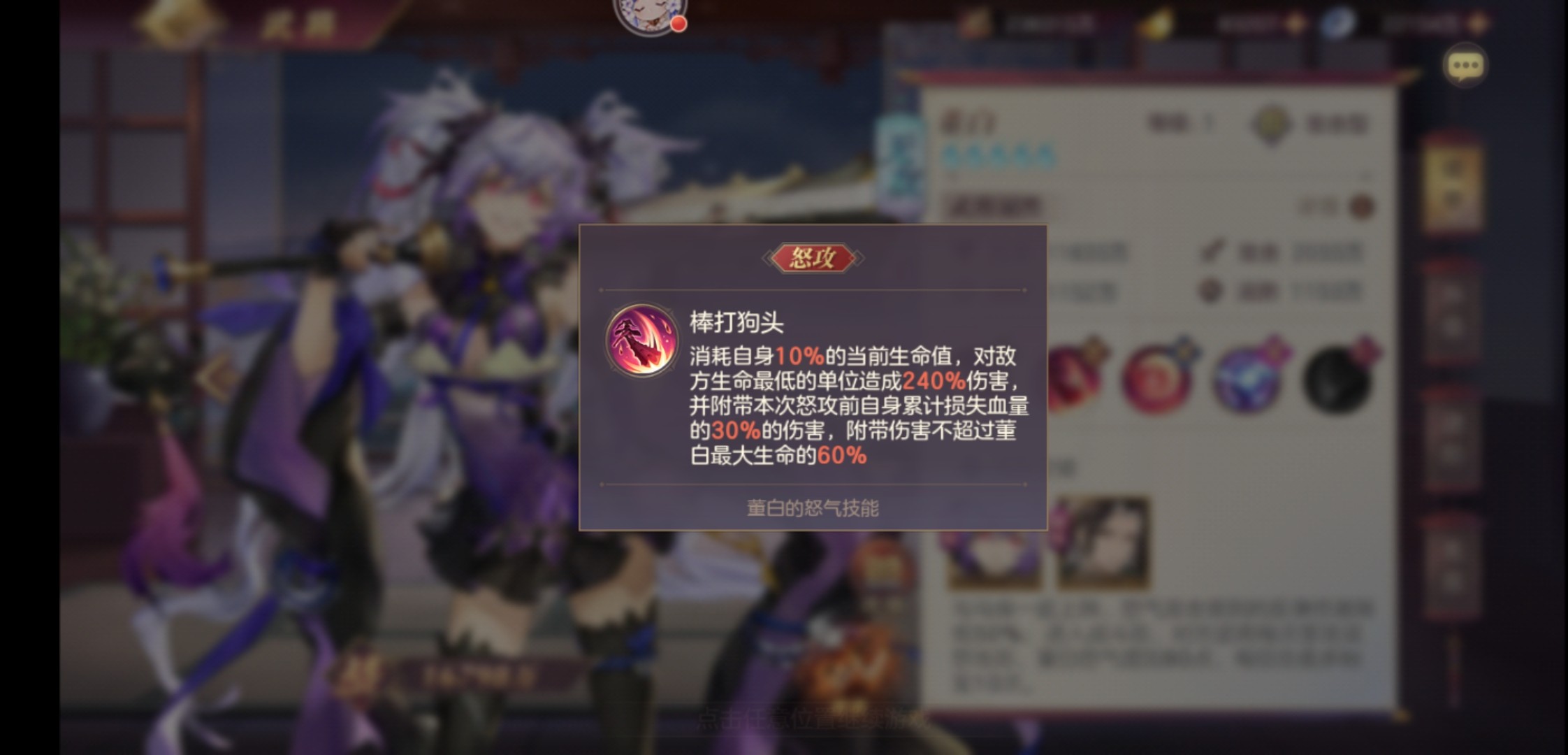 怒攻是董白的主要输出手段 以血量为代价提高单体爆发 这也就是为什么说董白和魏延机制相似的一点 利用自身血线打掉敌方血线 怒攻的直伤+物伤类似于潘凤 董白是否具备主c体质还得看体系搭配(需要以董白马良为核选择其他适配武将)