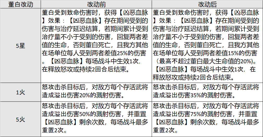 官方对董白改动给出的说明是“目前武将【董白】因5星技能“凶恶血脉”,使其对自身阵容造成的影响较高;本次调整将降低【董白】对己方武将造成的伤害,并提高"无双阶段"时的“溅射伤害”,使其在各阶段都拥有不错的伤害能力。”