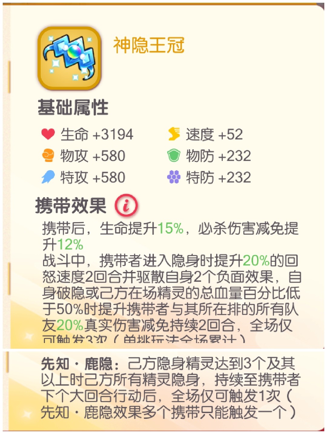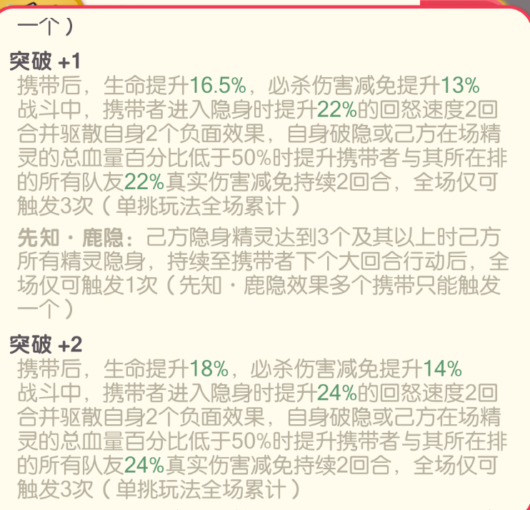 提高基础生命值上限和伤害减免,携带者隐身且结束隐身状态后触发清除负面和回怒加速效果,并给所在排的另外两个队友提升真实伤害减免。己方隐身精灵达到三个时使全队隐身跳过一回合