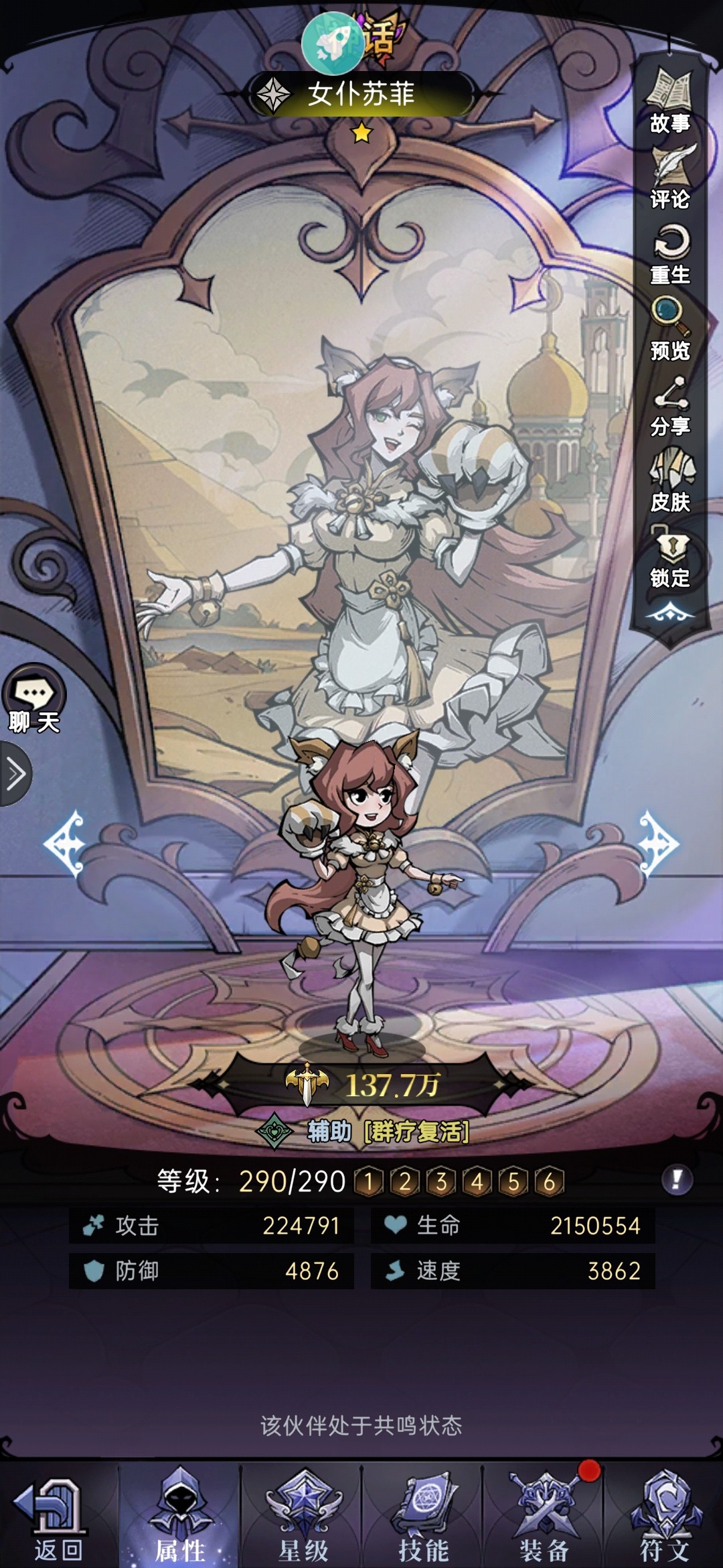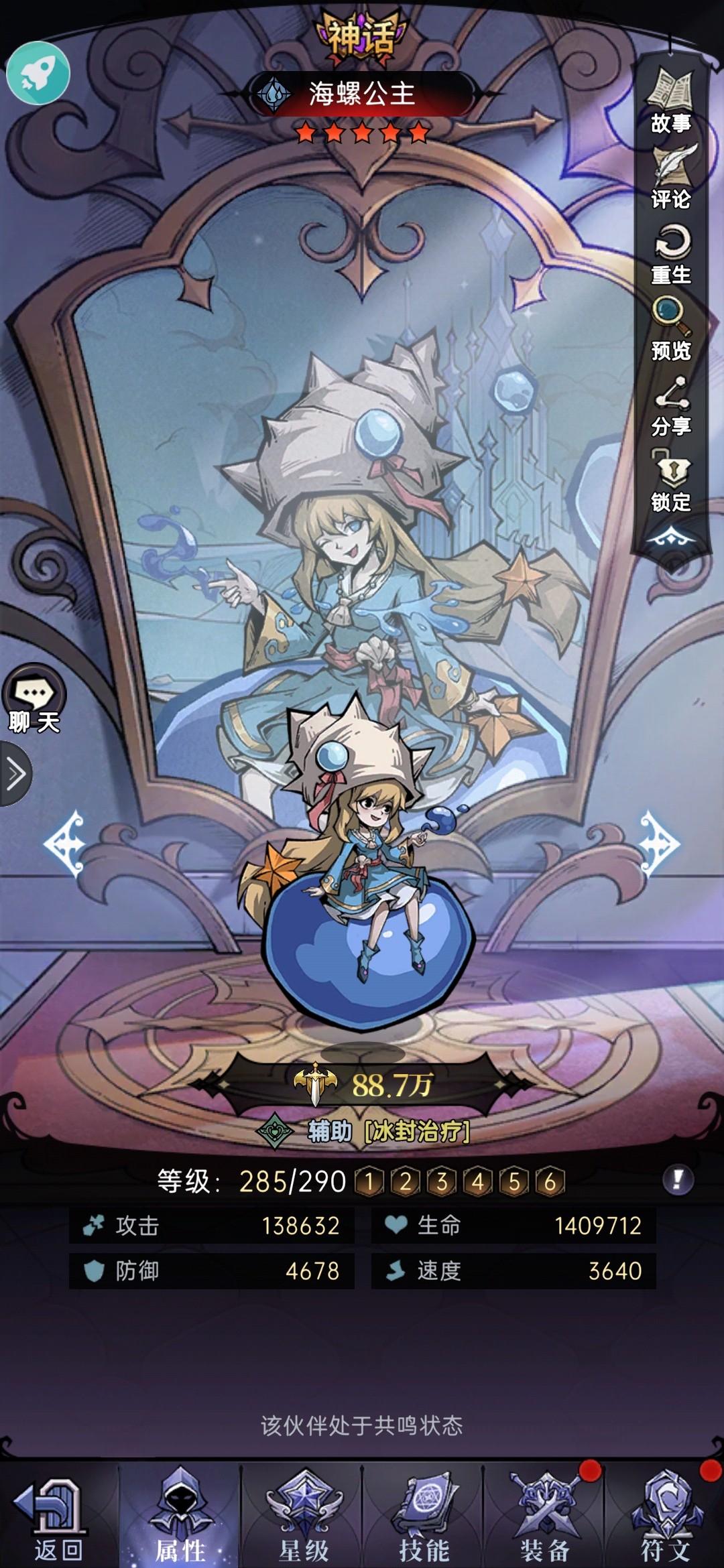 一技能:为己方全体恢复生命,并提供攻击与暴击增益,增益数值与暗系角色数量有关