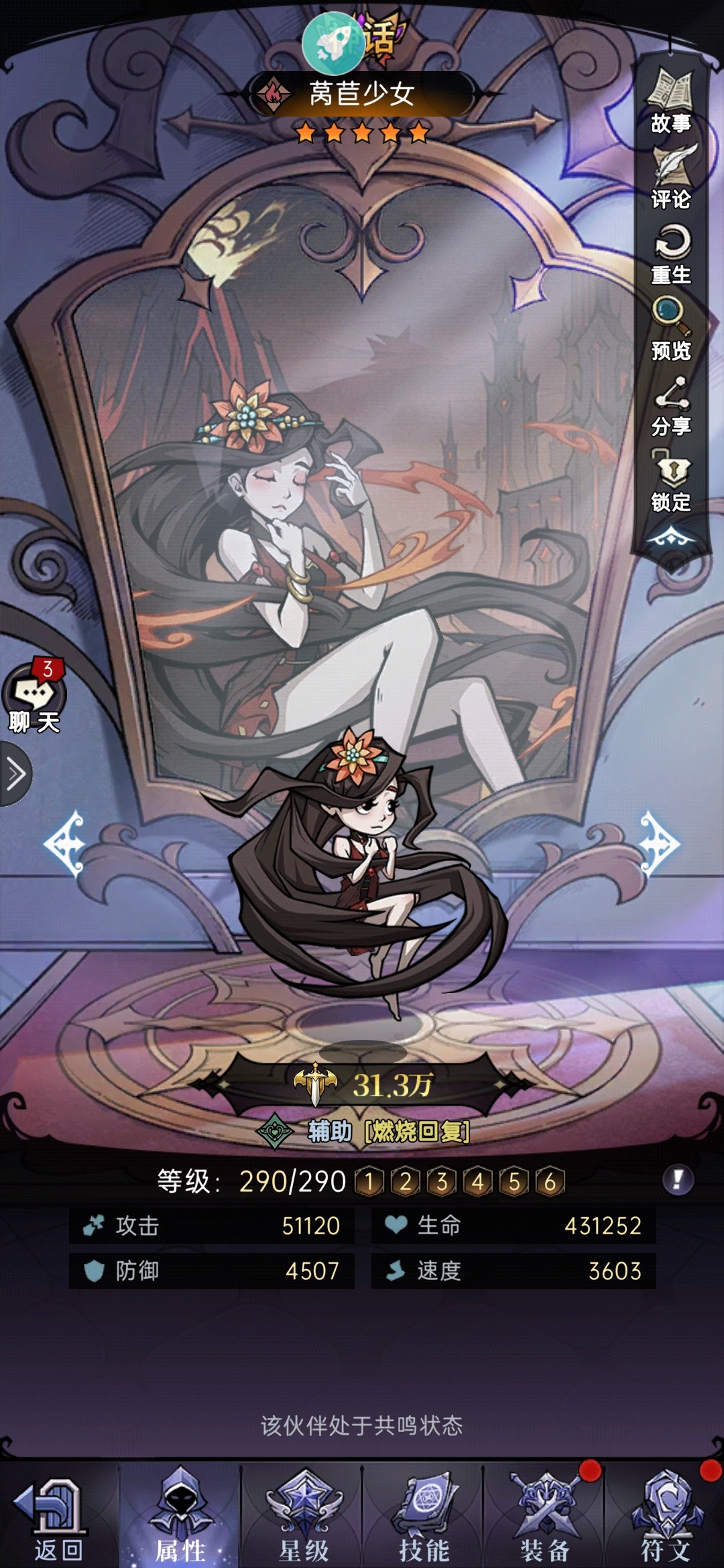 一技能:治疗生命最低的3个单位,提升20%爆率,为两个生命最低的单位增加20%受疗,10%抗爆,并为其附带受击叠加烈焰灼烧buff