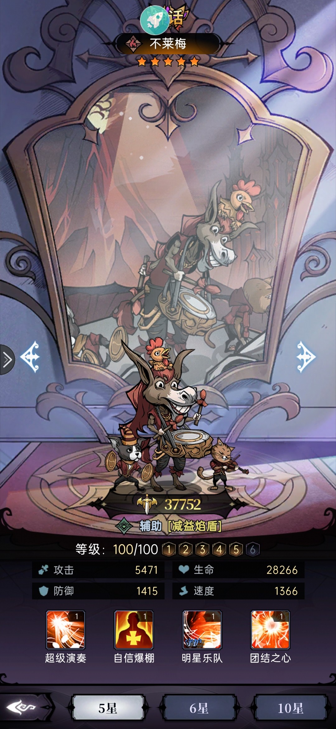 一技能:为己方全体回复生命并叠加星光印记,增加受疗与免伤,且为攻击最高的单位增加爆率