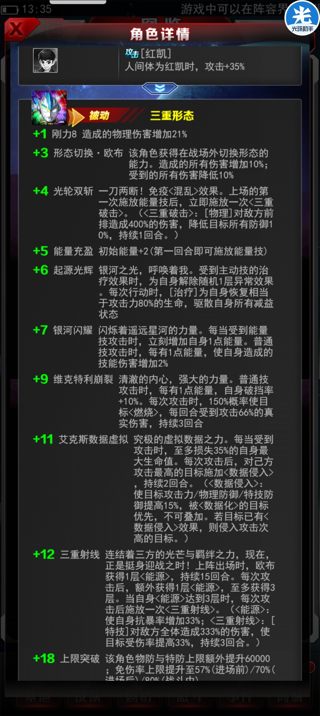 十12核心被动,出场获得能源一层加33%抗暴,提升生存,第二回合行动就可以叠加3层等同于加99%抗暴,同时3层后每回合行动释放三重射线,全体低比例伤害附带受伤率,被动技能不触发对方被动回血类技能,配合格罗布可以打出三段伤害