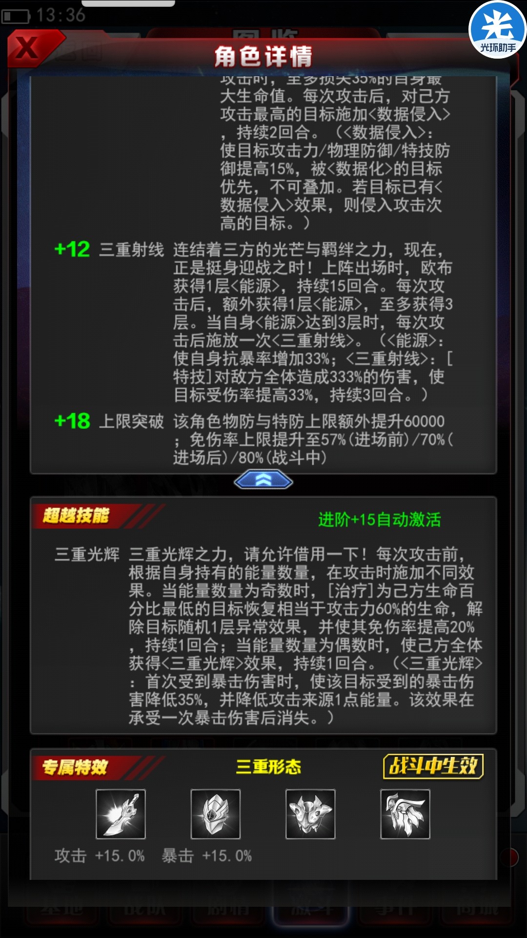 三重光辉,+15激活,被动核心被动,行动时能量为奇数时候,会给乙方生命比最低的角色回复相当于60%的生命,当偶数时全队获得三重光辉效果,首次被暴击降低35%爆伤