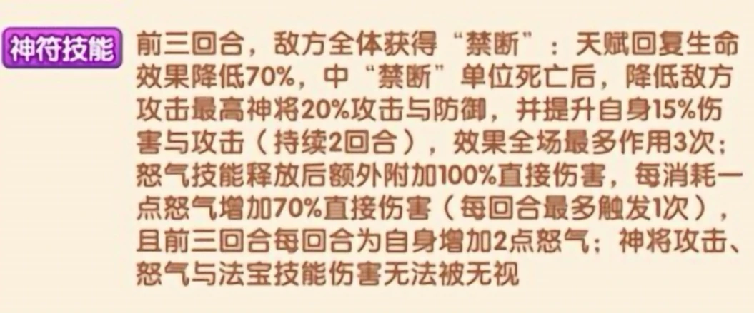 ①禁断效果:混元破尘符在开场就会对敌方施加“禁断”效果,进行血量回复与属性上的压制,在目前的游戏战斗中,基本上开场都会清除三个或以上酱油神将,可以再第一回合瞬间触发禁断的所有效果,直接降低敌方60%的攻击和防御,提高自身45%的伤害加成与攻击加成,从而更好的第一轮保护我方神将,在第二轮对对方神将造成巨额伤害。