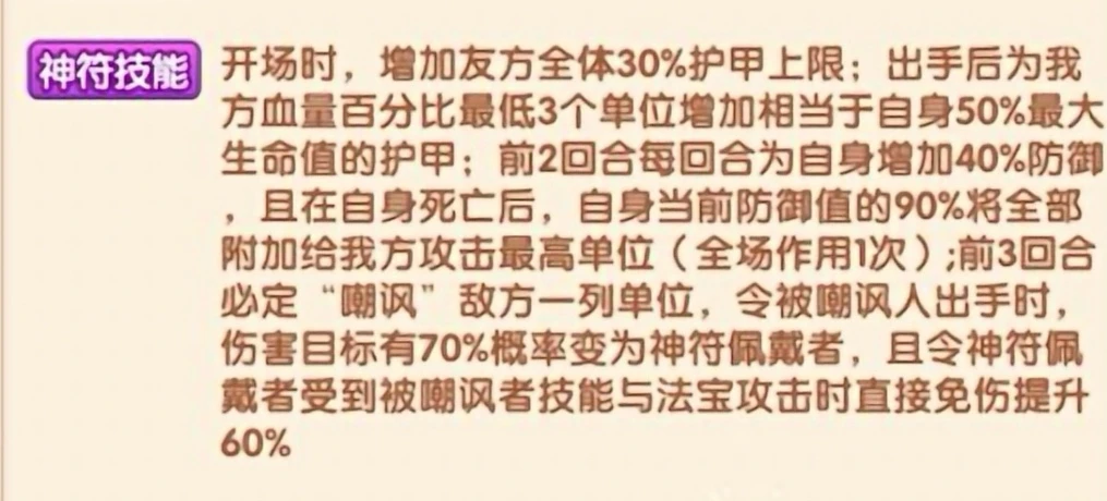1)前两回合,每回合提升自身百分之40的防御能力,当两回合后防御提升到百分之80,(如果配合上紫金土的能力,可以说是无敌肉,后续会出赤金神符配合法术的设想攻略)。