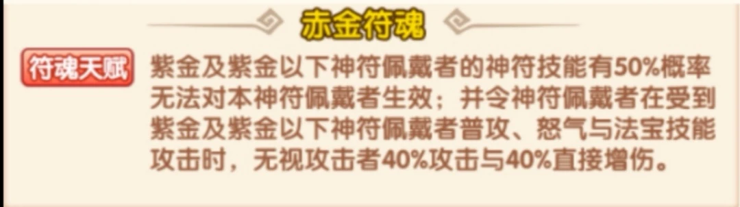 赤金神符对低品质的效果为,50%概率无视其神符技能与无视其40%的攻击与直接增伤,相当于直接压制低品质攻击型的神符,然后保护赤金神符佩戴者的生存环境,可以高端pvp战斗中,基本属性点满的情况下,赤金神符无视低品质神符40%的直接增伤就相当于多了半条命,多你半条命你怎么赢?