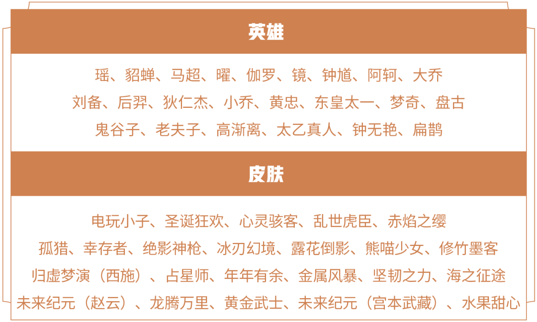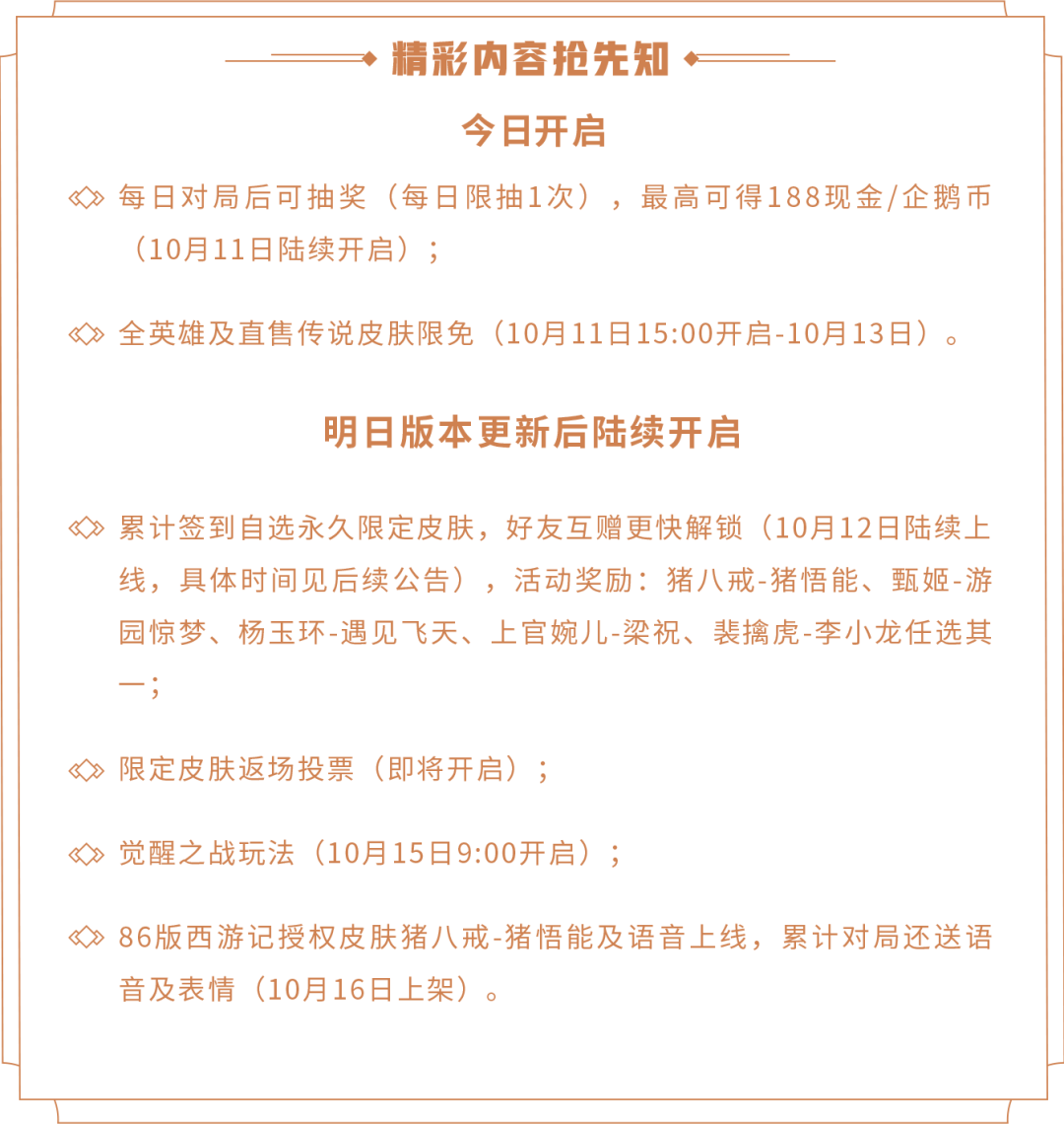 活动奖励:可获得永久限定皮肤(猪八戒-猪悟能、甄姬-游园惊梦、杨玉环-遇见飞天、上官婉儿-梁祝、裴擒虎-李小龙)任选其一
