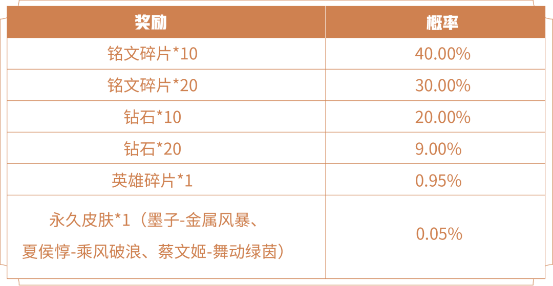 史诗皮肤幸运宝箱:打开后可获得以下奖励之一,铭文碎片*10、铭文碎片*20、钻石*10、钻石*20、英雄碎片*1、永久皮肤(墨子-金属风暴、夏侯惇-乘风破浪、蔡文姬-舞动绿茵)