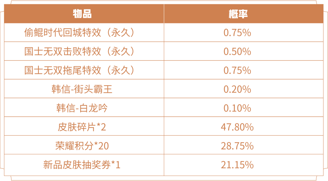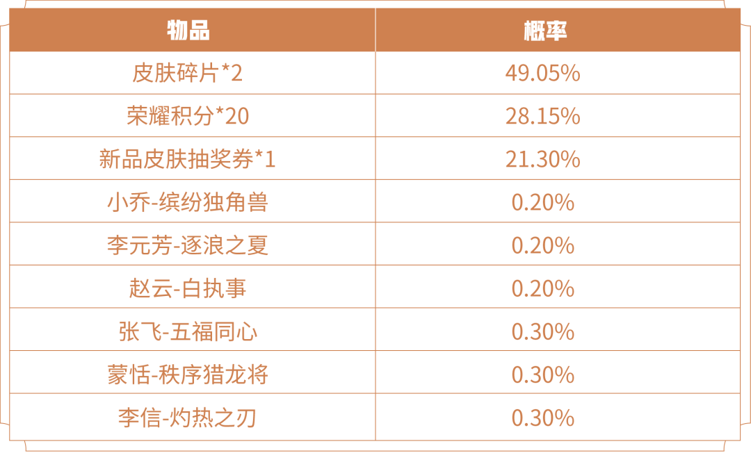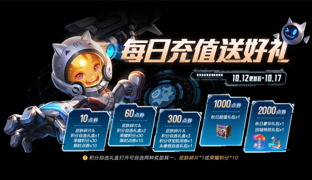 皮肤碎片&积分自选礼盒:打开礼包可任意选择以下奖励之一,荣耀积分*10或皮肤碎片*1