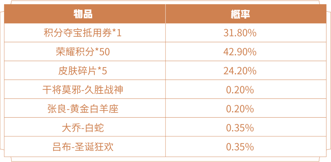 优选皮肤秘宝:购买酷炫机甲(1日),可额外随机获得以下之一,干将莫邪-久胜战神、张良-黄金白羊座、大乔-白蛇、吕布-圣诞狂欢、荣耀积分*50、积分夺宝抵用券*1、皮肤碎片*5