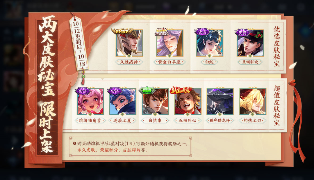 超值皮肤秘宝:购买红蓝对决(1日),可额外随机获得以下之一,小乔-缤纷独角兽、李元芳-逐浪之夏、赵云-白执事、张飞-五福同心、蒙恬-秩序猎龙将、李信-灼热之刃、荣耀积分*20、新品皮肤抽奖券*1、皮肤碎片*2